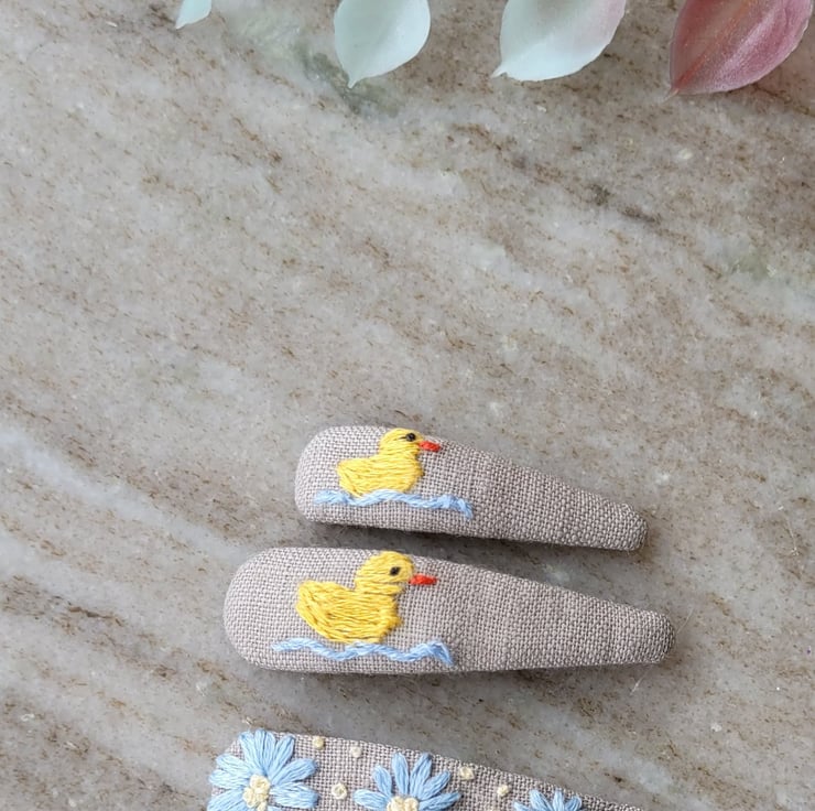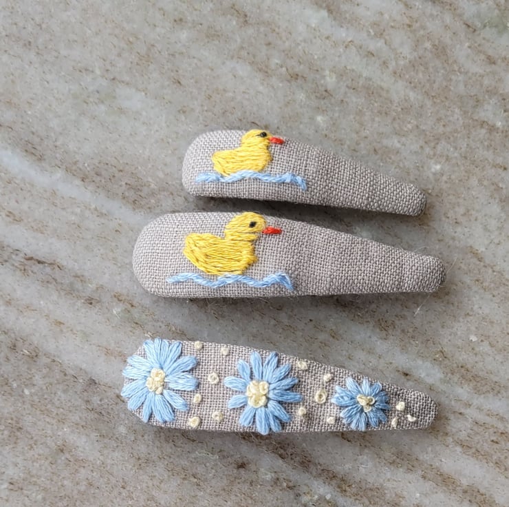 Hand embroidered hair clips, cute duckling, spring, easter chicks yellow, blue
