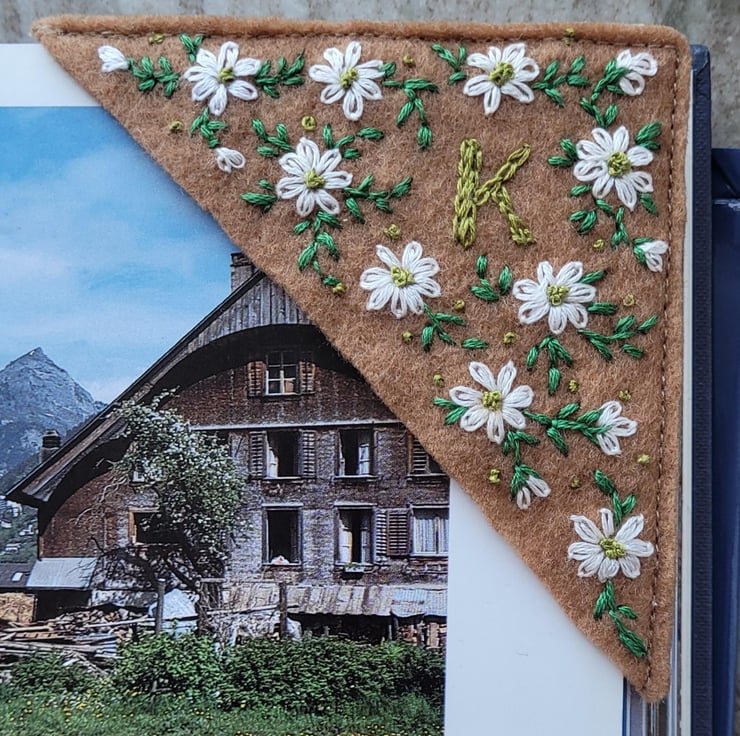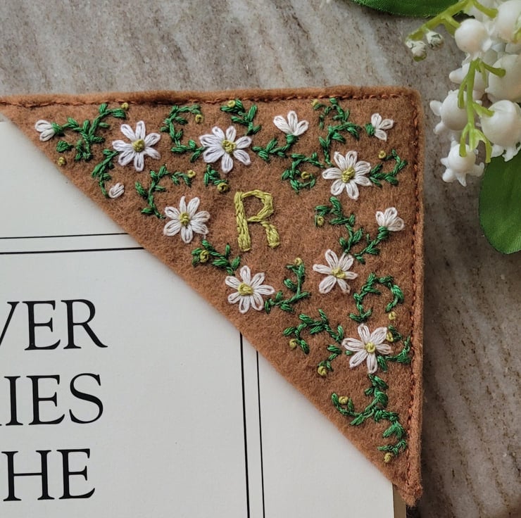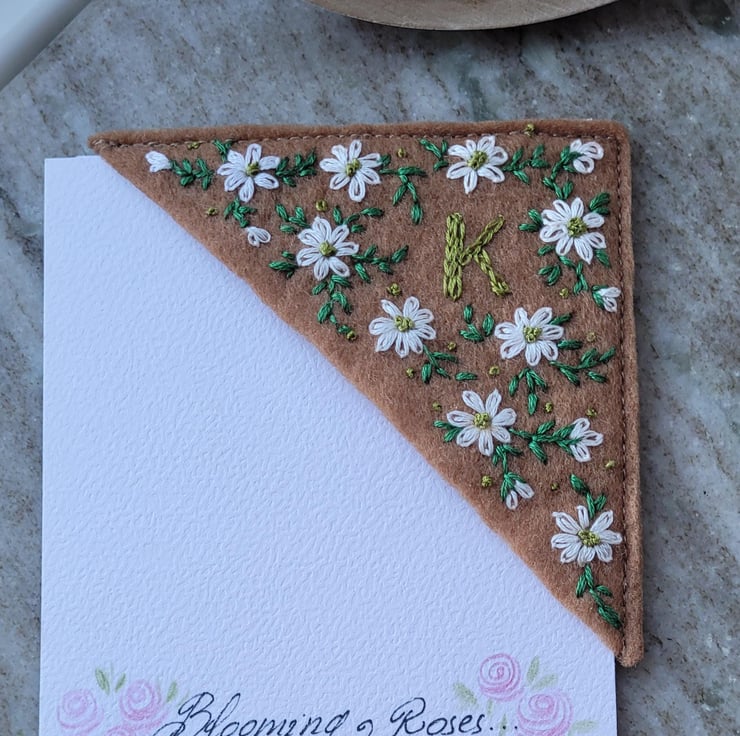 Personalised letter Corner Bookmark, hand embroidered daisies and buds, mum gift