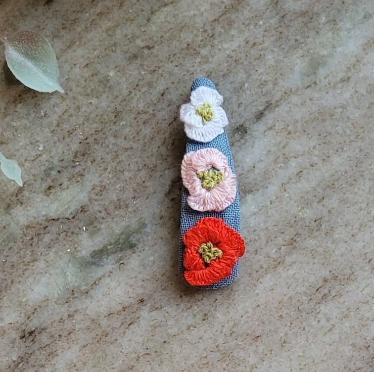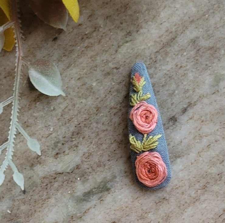 These hand embroidered hair clips are lovingly made with high quality 100% cotton and linen fabric & embroidery floss the clips are 5cm long. All my pieces are designed by myself so they are unique.