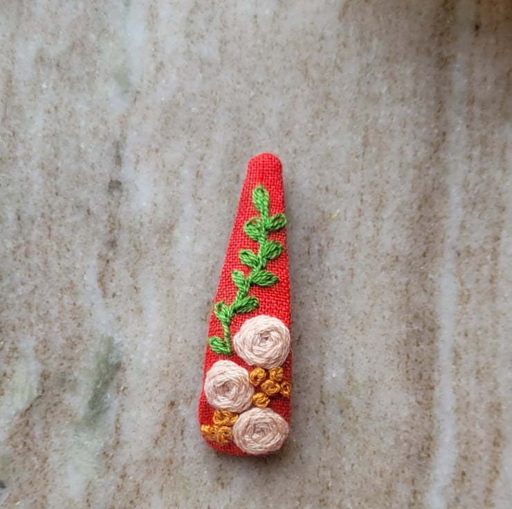 These hand embroidered hair clips are lovingly made with high quality 100% pure linen fabric & DMC embroidery floss. the clips are 6 cm long.