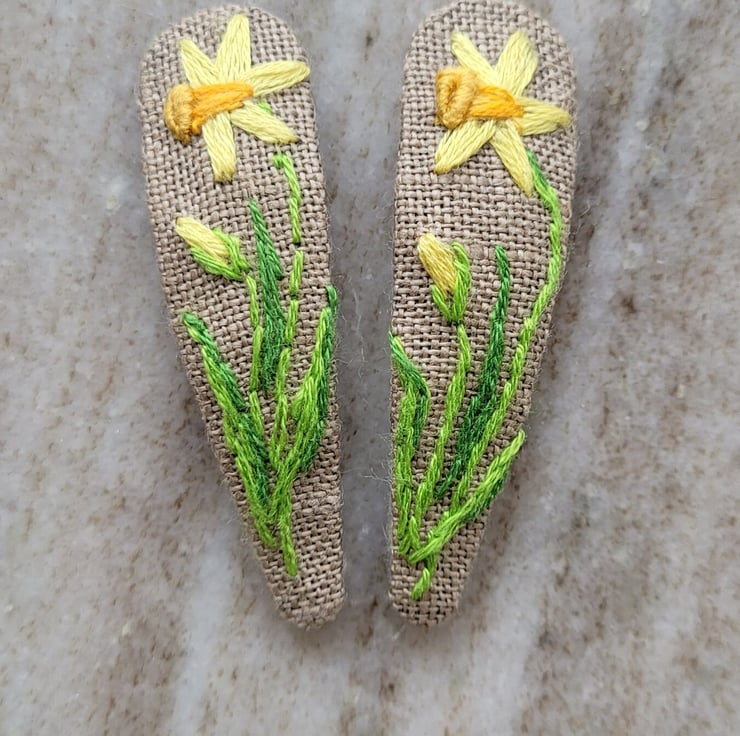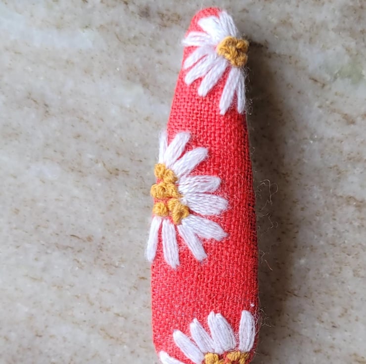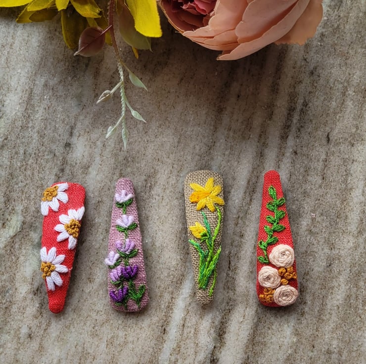 Hand embroidered hair clips.