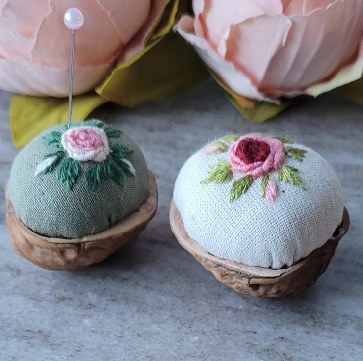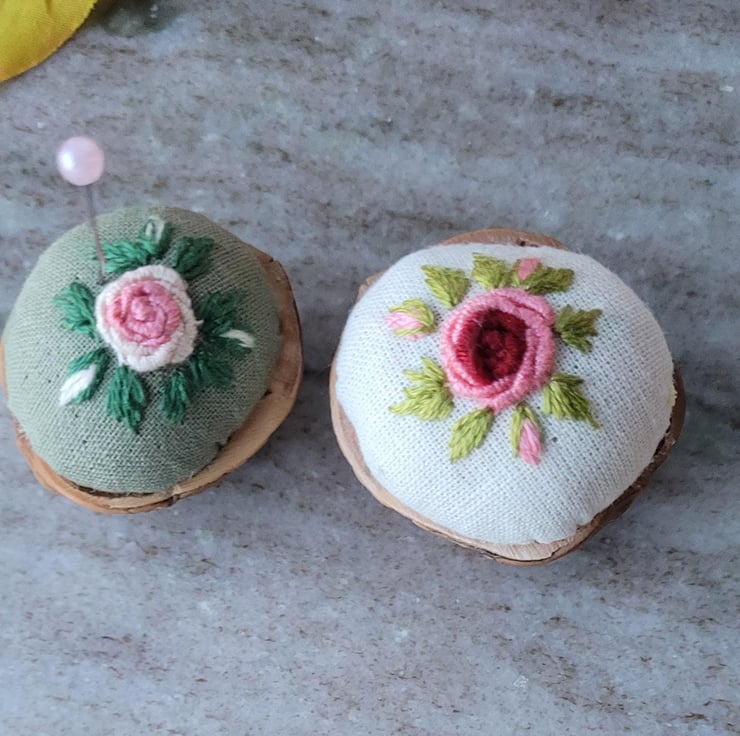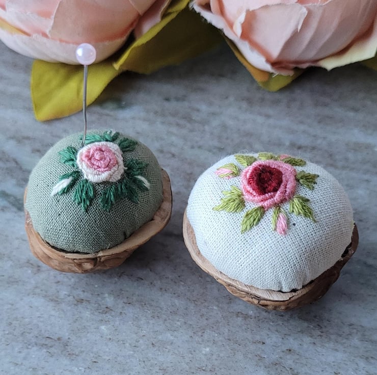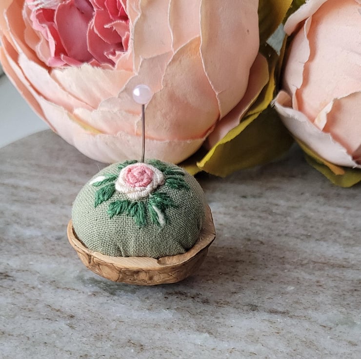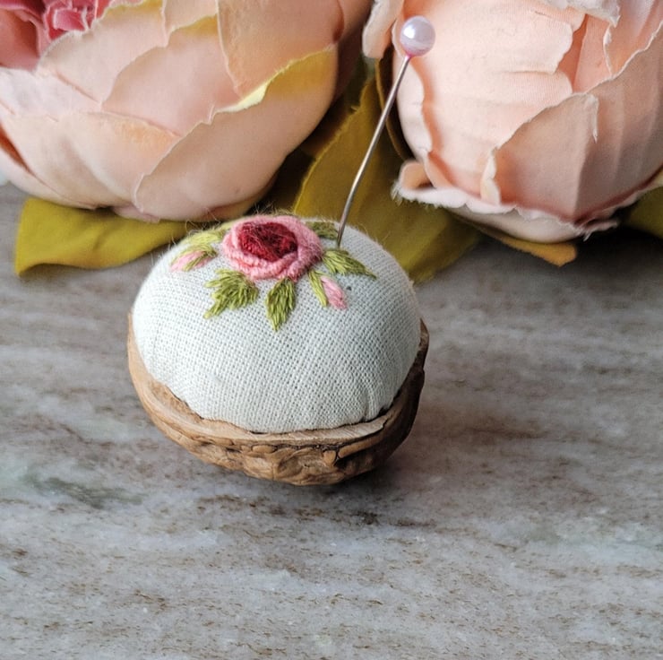 This lovely pin cushion is hand embroidered with DMC embroidery floss on 100% pure cotton fabric. the cusion is attached to a natural walnut shell.