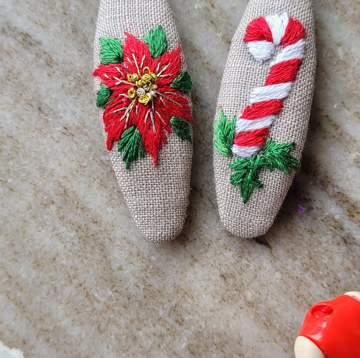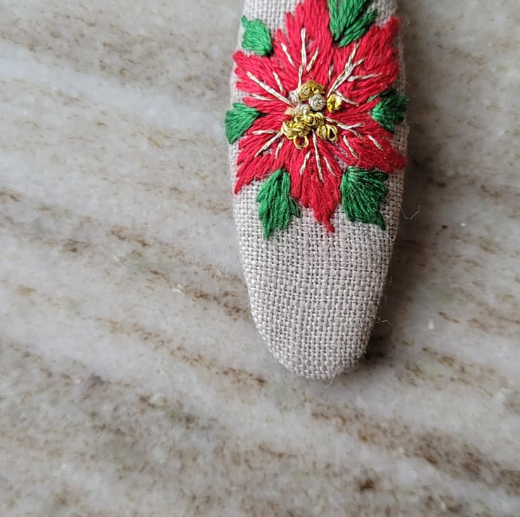 The pointsetta is decorated with and a gold thread. the back of the clip is covered with felt. the clips are 6cm long.