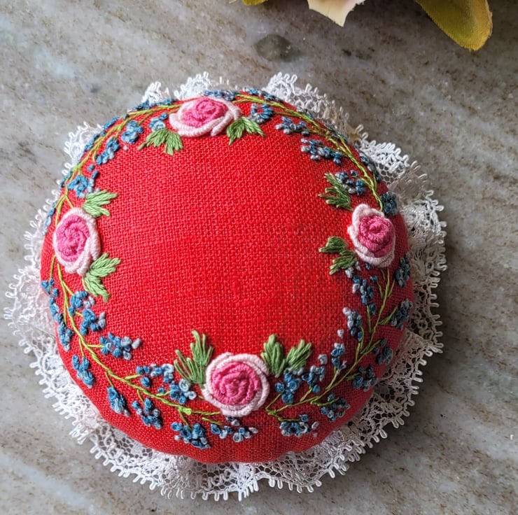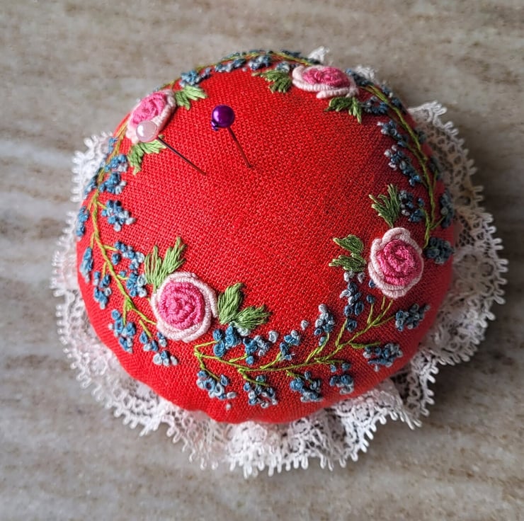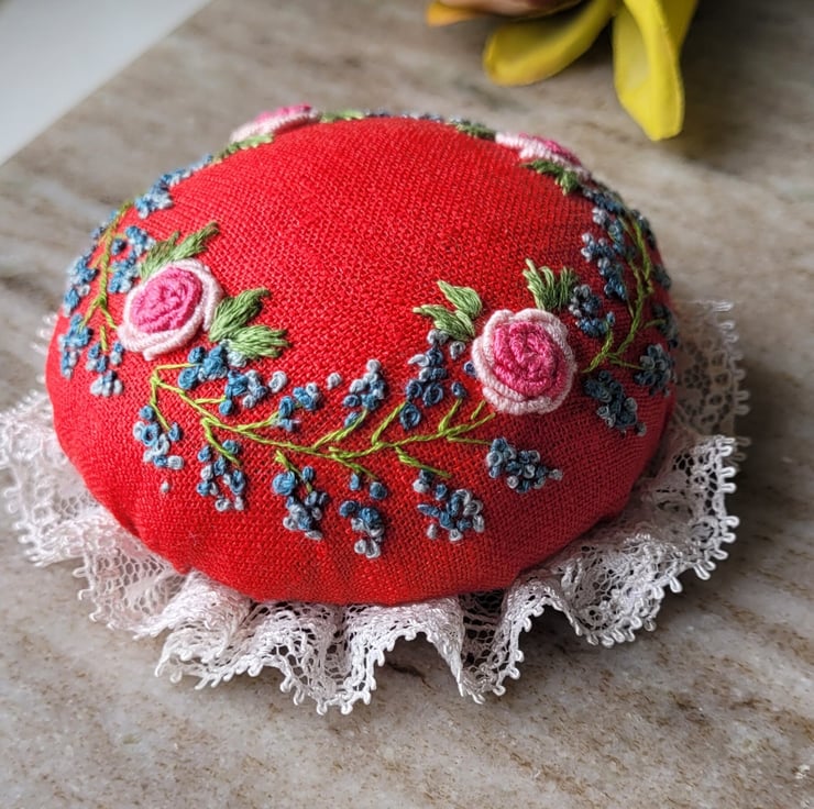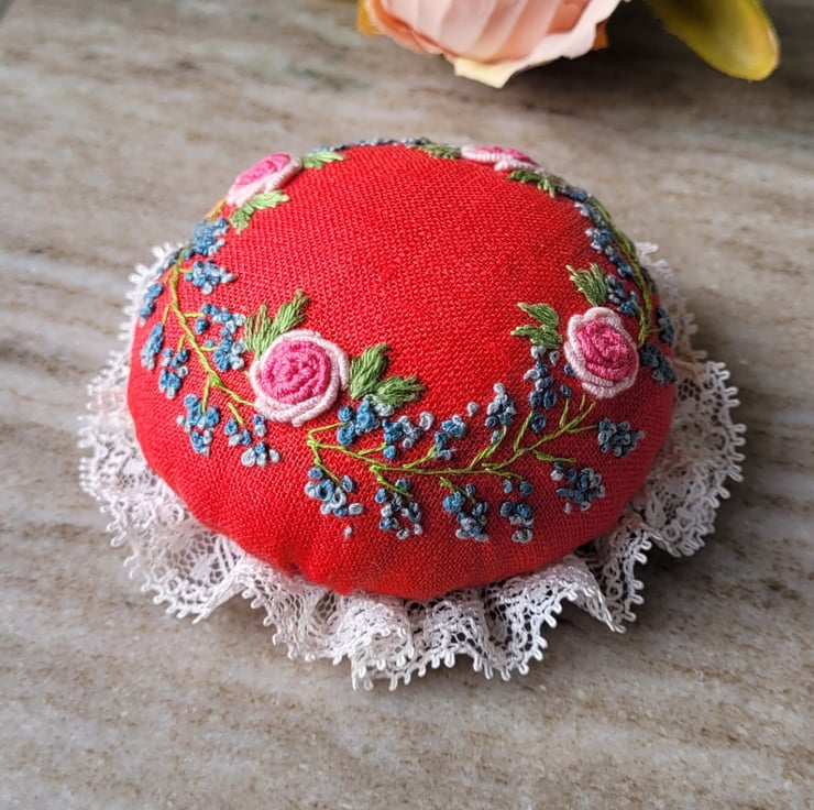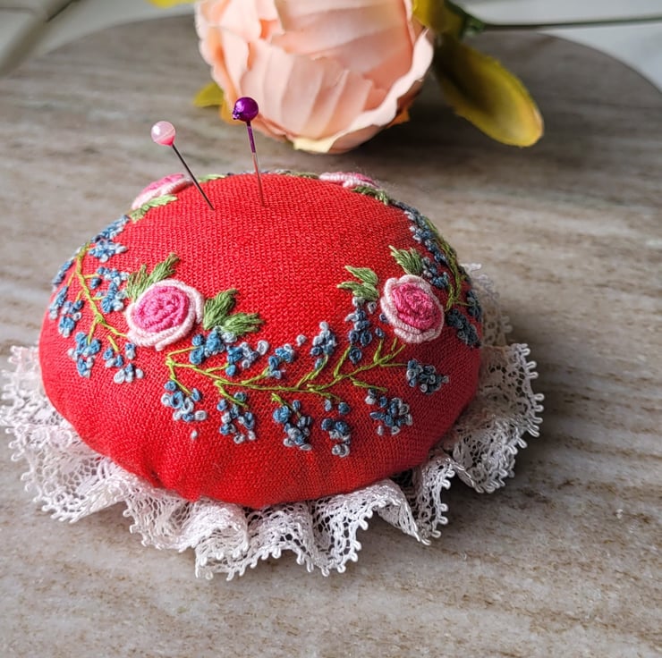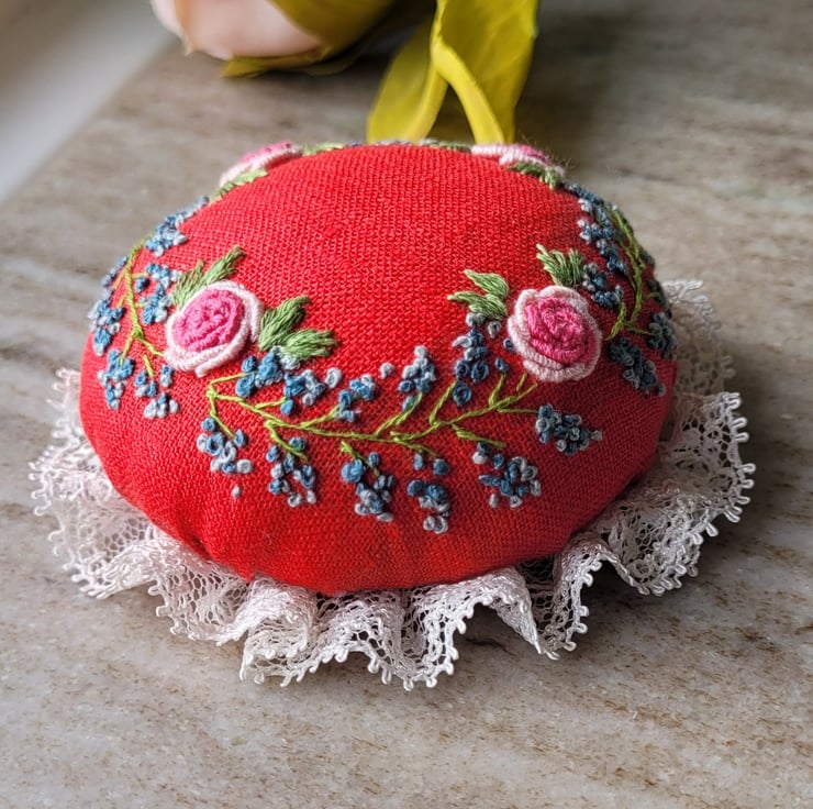 red roses pin cushion, pink hand embroidered, vintage style, seamstress gift