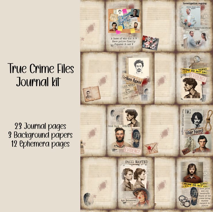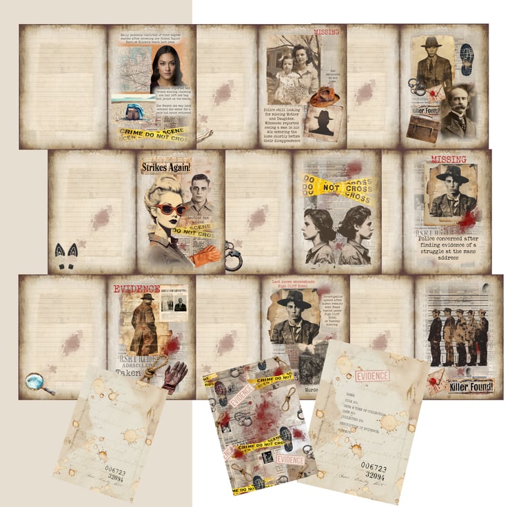 Enjoy crafting with this beautifully crafted digital download collection. Perfect for scrapbooking, journaling, and adding a touch of charm to your creative projects, this set features a carefully curated selection of true crime themed ephemera and journal pages.