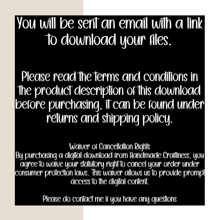 Refund Policy for Digital Downloads Acceptance of Terms By completing your purchase, you acknowledge and accept this refund policy. At Handmade Craftiness, we are committed to providing high-quality digital products. Please read our refund policy carefully before making a purchase: Waiver of Cancellation Rights By purchasing a digital download from Handmade Craftiness, you agree to waive your statutory right to cancel your order under consumer protection laws. This waiver allows us to provide prompt access to the digital content. No Refunds After Download For digital downloads, consumers are required to waive their cancellation rights before the digital content can be provided. This means that once a customer (i.e., the consumer) has downloaded the content, they have given up their consumer rights to a refund. This policy aligns with consumer law for digital goods, ensuring the protection of intellectual property and preventing unauthorized distribution. Cancelling a Digital Download Under the Consumer Contracts Regulations 2013, digital downloads are neither goods nor services, meaning the law is a little different. If you want to download something within 14 days of buying it (known as the 'cooling-off’ period), you must give your consent to waive the 14-day cooling-off period. If you do not give your consent, the 14-day cooling-off period still applies. However, you will not be able to download your digital content until this period has ended. This policy exists to prevent customers from changing their minds after downloading the content. As you are being sent a link via email to download after purchase this will count as downloading the content as you will have access to download the files from the email. Eligibility for Refunds Refunds may only be issued under exceptional circumstances, such as: The digital content is proven to be defective or incomplete. An error on our part (e.g., duplicate billing). Contact Us If you believe you are eligible for a refund due to one of the exceptional circumstances above, please contact us at orders@handmadecraftiness.co.uk with your order details, a description of the issue, and proof of purchase. Our team will review your request and respond within 7 business days. For further inquiries, please contact us at orders@handmadecraftiness.co.uk. ------------------------------------------------------------------------------------------------------------------------------------------------------------- Ownership and Usage: All artwork within this shop is the exclusive property of Handmadecraftiness. You are expressly prohibited from reproducing, altering, redistributing, reselling, or claiming ownership of any digital item from this store. However, you are permitted to incorporate products from this store into your own physical handmade items for sale as a hobbyist. TERMS OF USE 1. You may print and use these items in a tangible journal/scrapbook/craft project etc. 2. You MAY NOT sell or share these files. 3. You MAY NOT reproduce/altar/redistribute our designs as a digital or physical item. 4. You MAY NOT sell or manipulate these files for resale purposes. 5. You MAY NOT share these files individually or as kits.