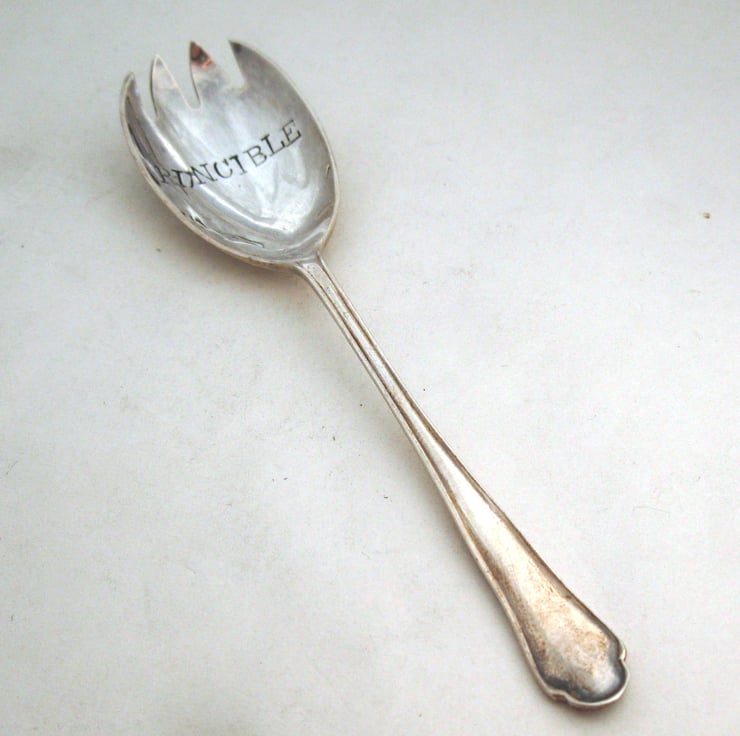 A little vintage runcible spoon (yes, really, as per The Owl and the Pussycat) with teeth cut into the bowl and a 'dognose' style handle. I've hand stamped it 'RUNCIBLE' with Victorian antique stamping dies. A perfect small gift for anyone who loves quirky old stuff, it's just right for fishing slippery olives or preserved ginger out of a jar or you could go full-on Edward Lear and dine on mince and slices of quince... do be careful though, the teeth are quite sharp so I'd recommend using this as a serving implement only and NOT putting it in your mouth. Also keep out of reach of unsupervised children, just in case. Although if they want to know what the 'runcible spoon' in the poem is, you can show them an actual real one!