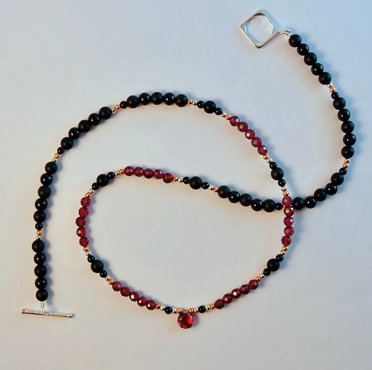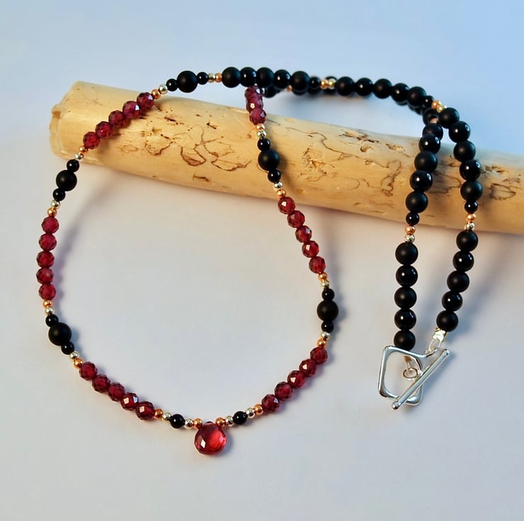 The faceted beads are a deep raspberry colour with a lovely sparkle, emphasised by the bright copper and silver and the contrasting black Onyx.