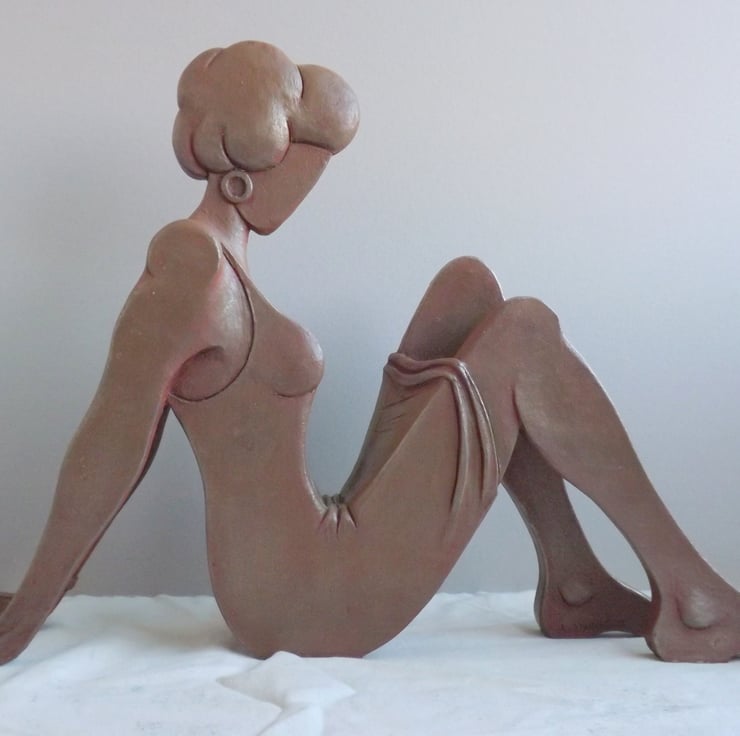 This sculpture is 32cm tall and features a woman sitting on the floor in a dress.