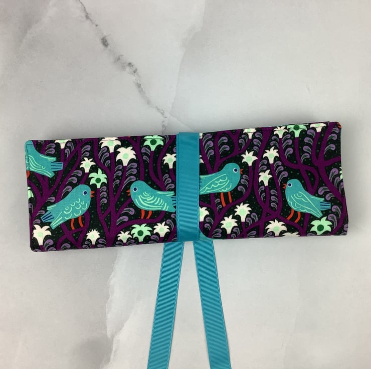 Handmade fabric jewellery roll in a fun bold modern purple and turquoise cotton fabric and lined in a turquoise cotton.