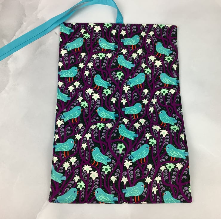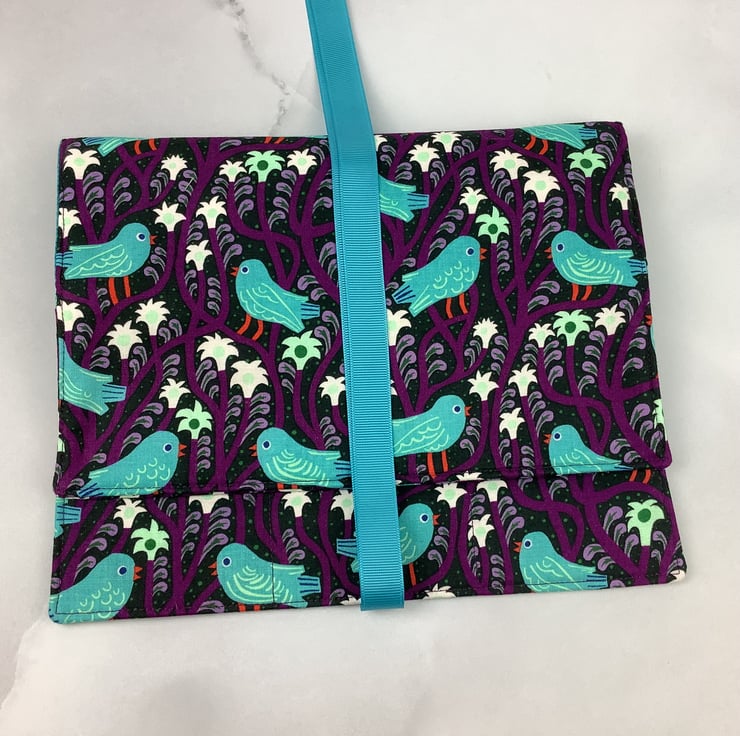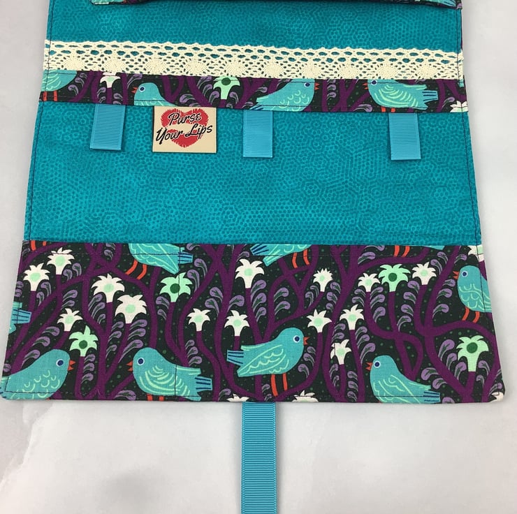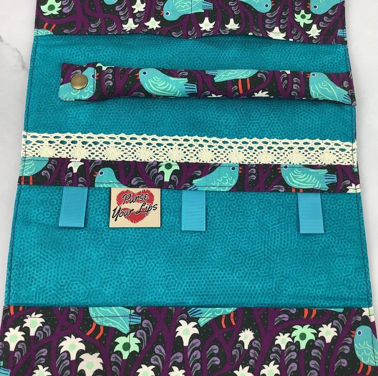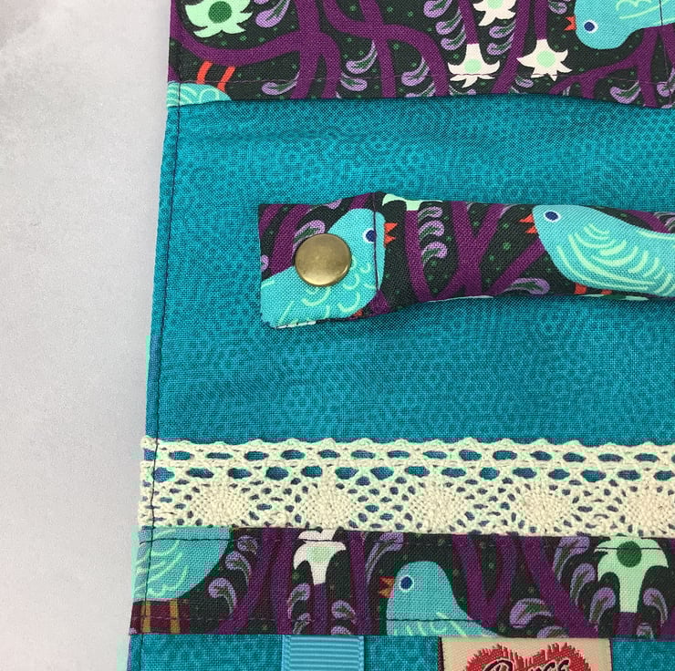 Handmade fabric jewellery roll in a fun bold modern purple and turquoise cotton fabric and lined in a turquoise cotton.