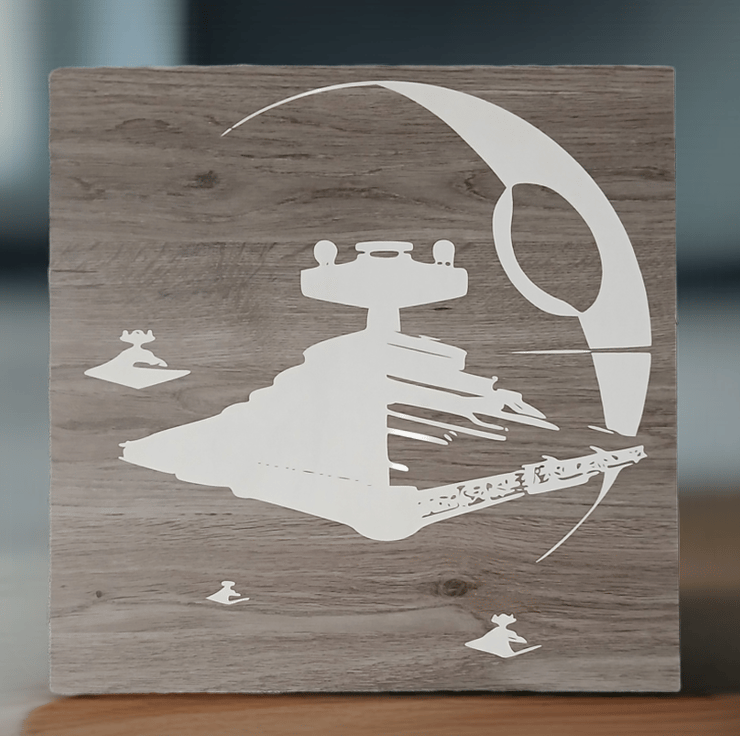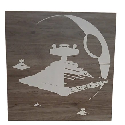 390mm x 390mm wall art on quality Melamine Coat and high density MDF. Features Death Star and Star Destroyers