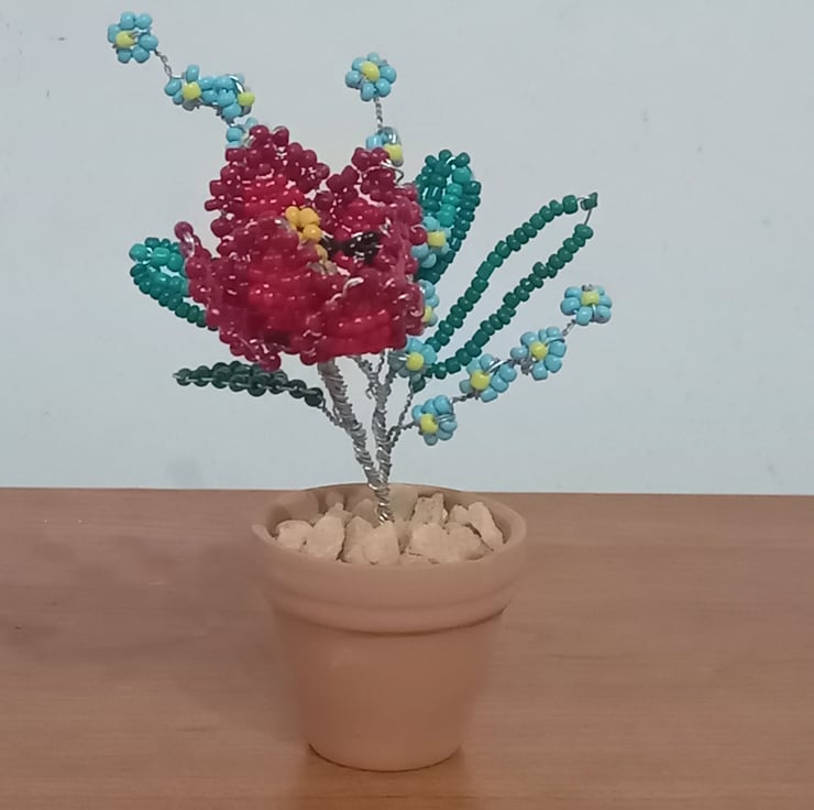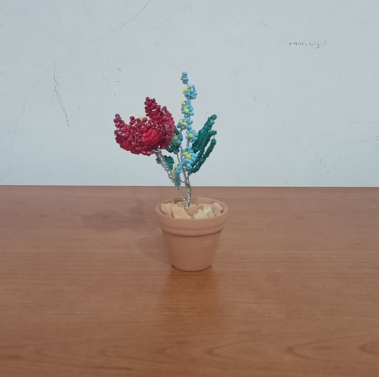 The composition is about 7cm high and 5cm wide, with little clay pot and stones inside it. The wire is copper. The flowers are made out of pony beads.
