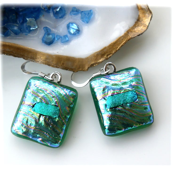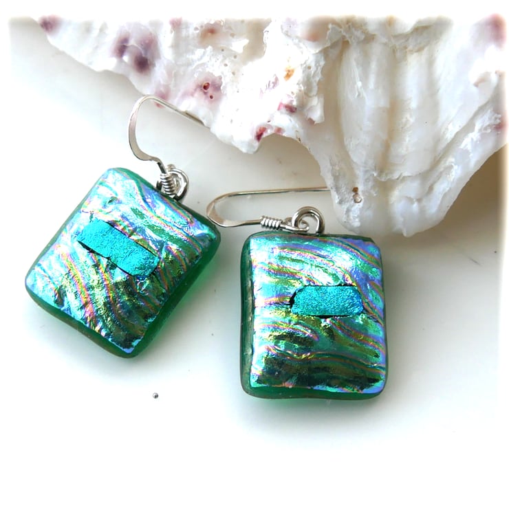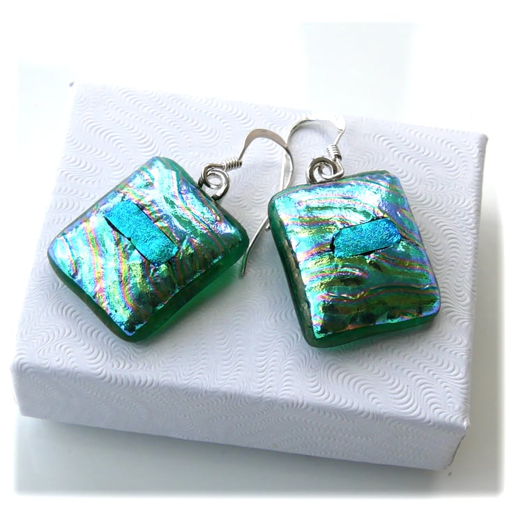 I've taken several photos of the earrings to try to show you the colour which changes in the light. this is a feature of wonderful dichroic glass.