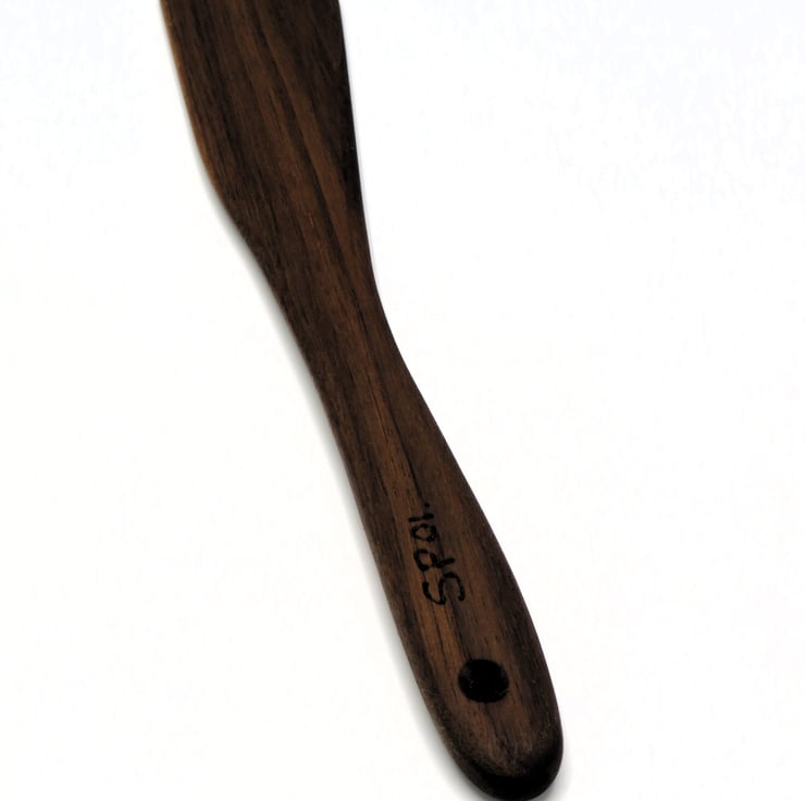 The timber used is black walnut which is a fruit wood, so it should not have any toxins when cooking meals. This spatula is coated in sunflower oil to protect it from water ingress. This item is number SP01 and this is pyrographed on the handle as our items are original and limited editions. Shaped using a spokeshave, small chisel and a block plane, and finish with various grades of sandpaper. Then marinated in sunflower oil for 4 hours, wiped clean and polished with a soft cloth.