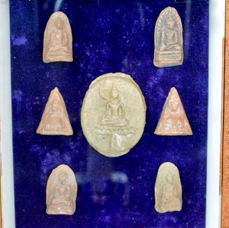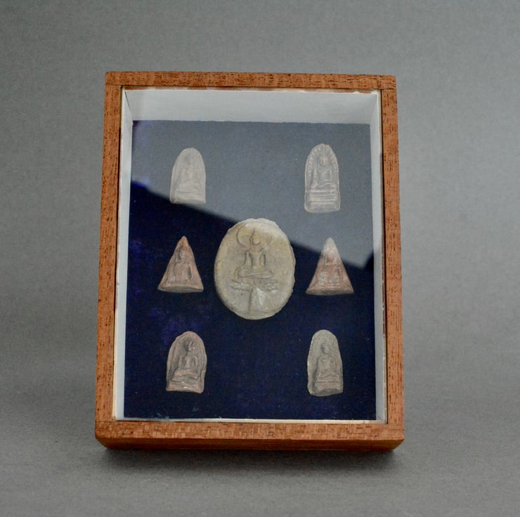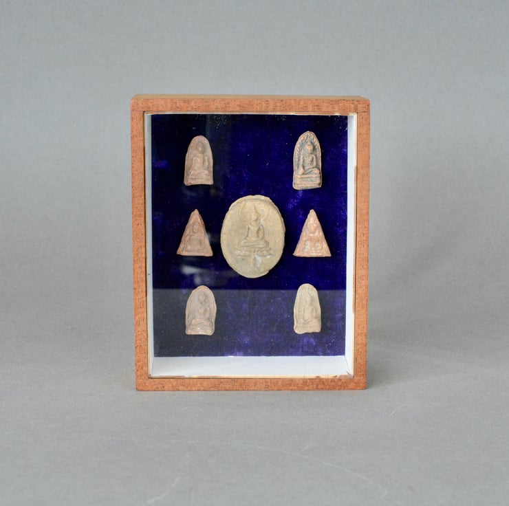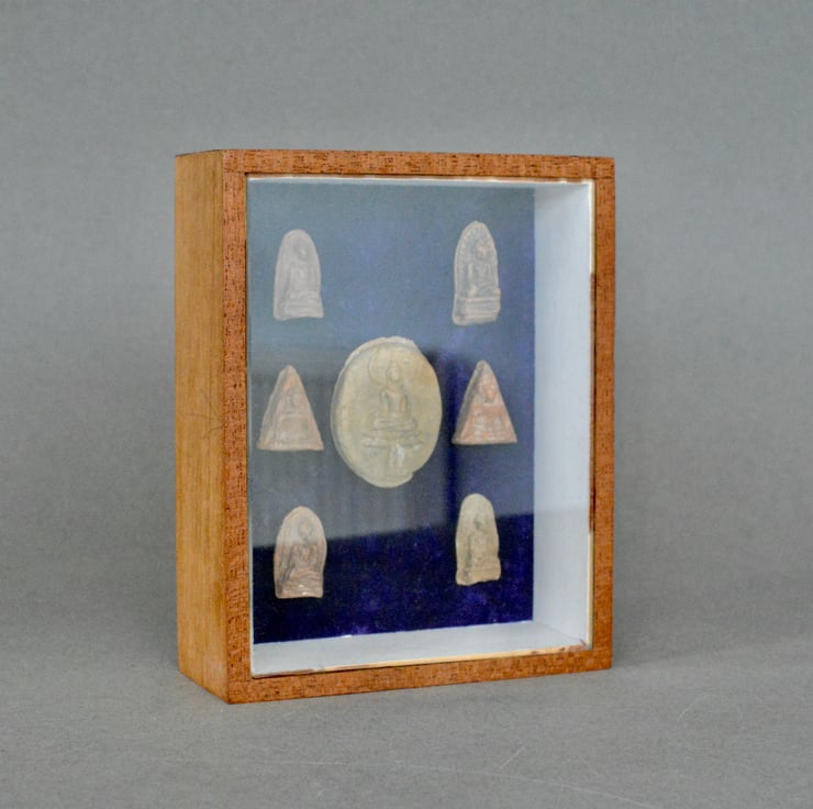A group of antique Thai Buddha amulets which I have mounted in a wooden box frame. The amulets have been left at shrines as offerings. Each piece is handmade from clay by the senior monks as they are believed to pass more power to the amulet. 12.7cms tall, 10.2cms wide and 3.8cms deep.