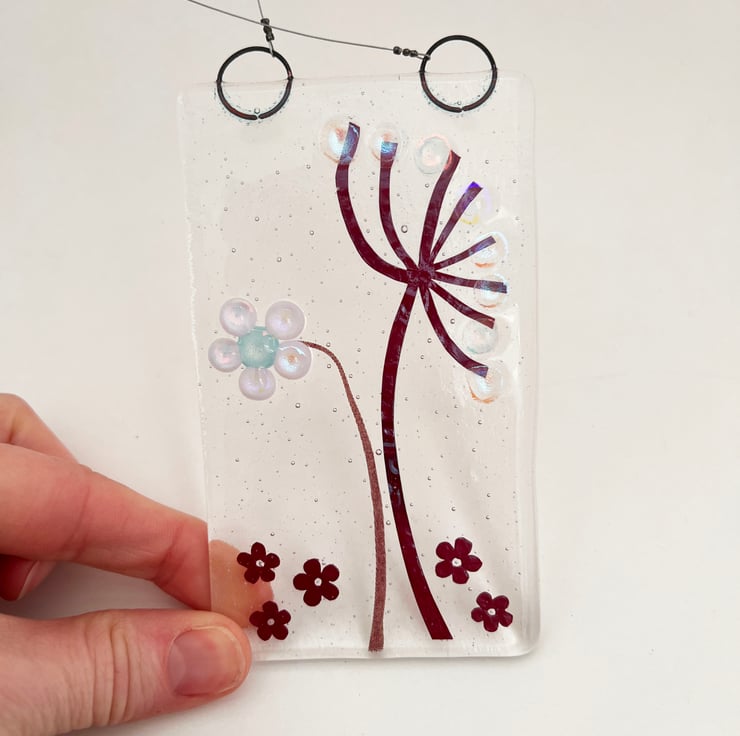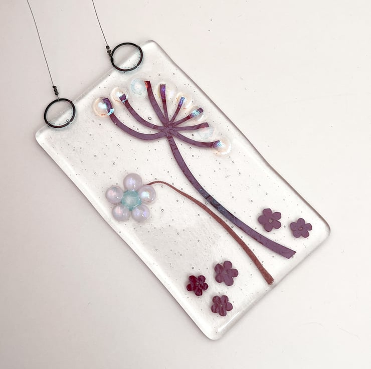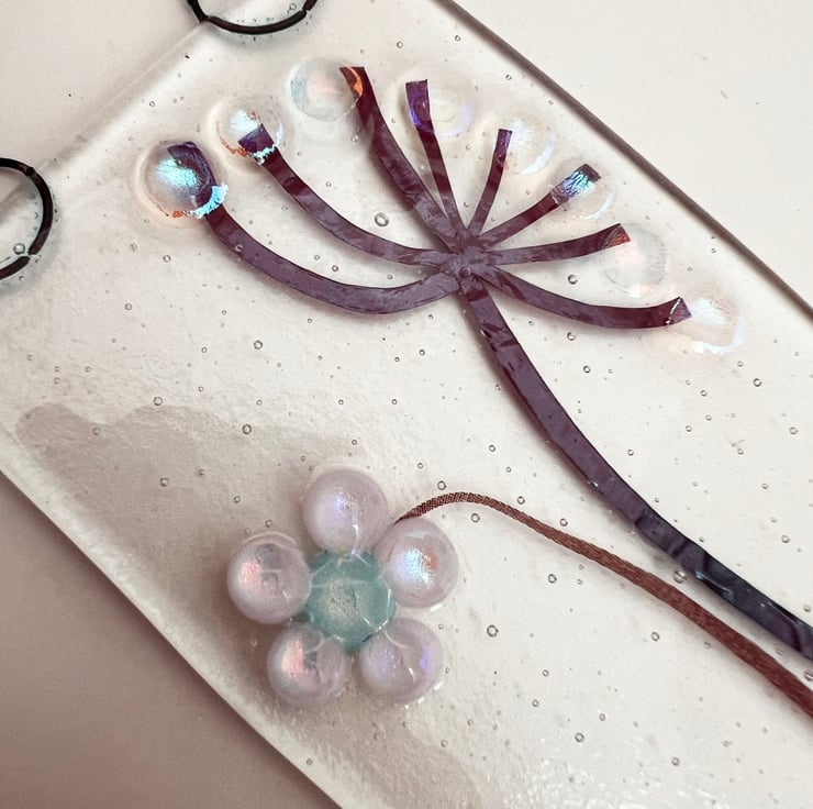 Fused glass hanging suncatcher, featuring copper stems, copper flowers and pale pink and dichroic petals.