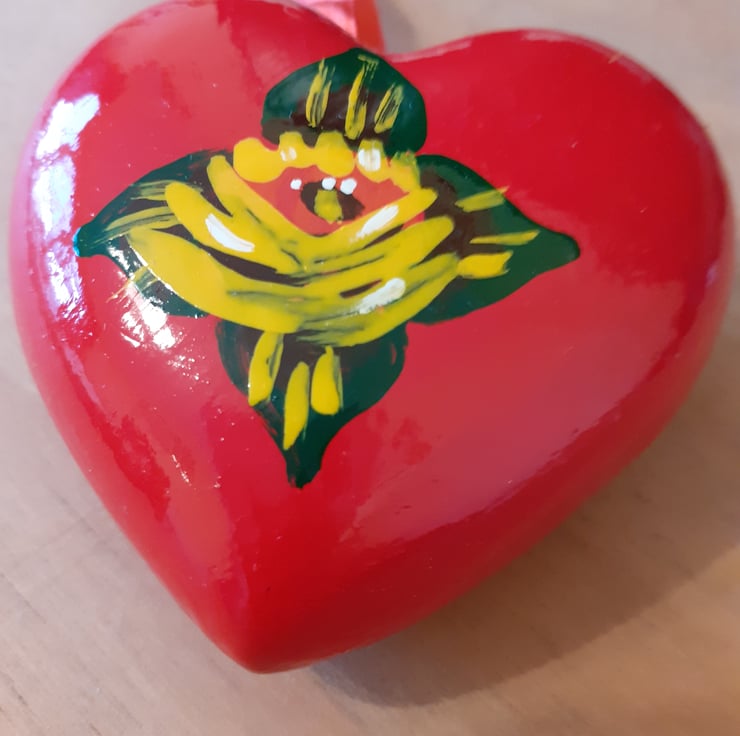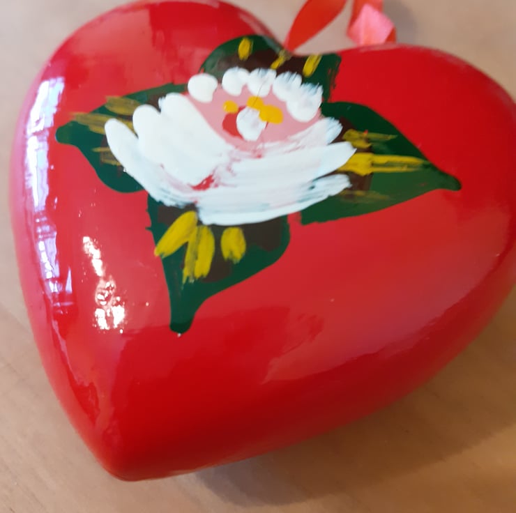 A ceramic heart shaped bauble, painted bright red. It has a yellow canal art style rose on one side and a white one on the other. Red ribbon is attached for hanging.