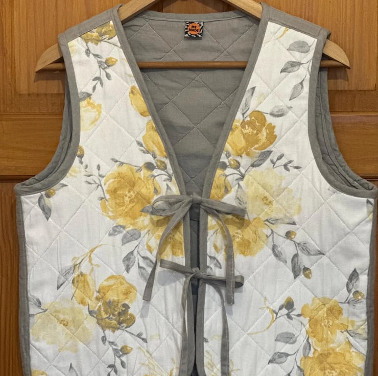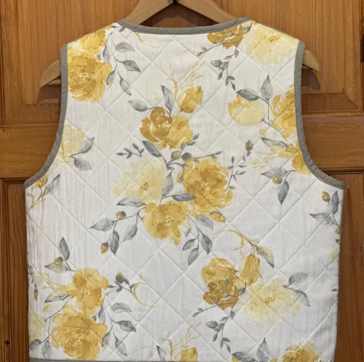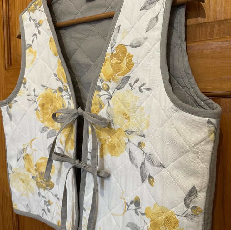 In this listing you have a beautiful floral and grey linen quilted vest - just like the latest fashion trends - this one fit size 10-12 or small/medium and got ties