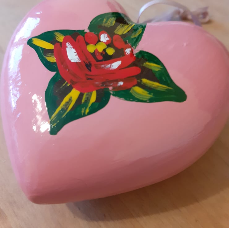 A ceramic heart shaped bauble, painted pink. It has a red canal art style rose on one side and a daisy on the other. Dusky pink ribbon is attached for hanging.