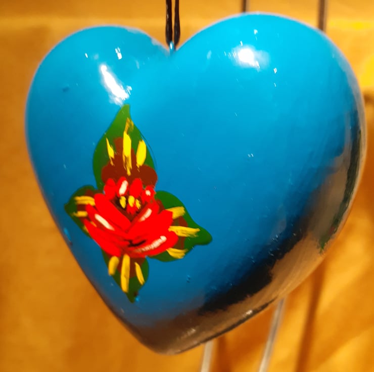 A ceramic heart shaped bauble, painted bright blue. It has a red canal art style rose on one side and a white one on the other. Black ribbon is attached for hanging.