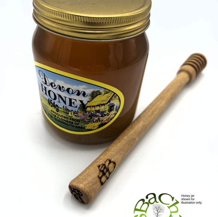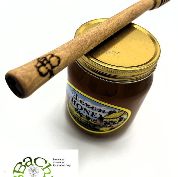 This English Beech honey dippers is larger than normal shop bought ones, making them easier to hold. Barbara turned this limited edition dipper and pyrographed the end of the handle, with the item number.