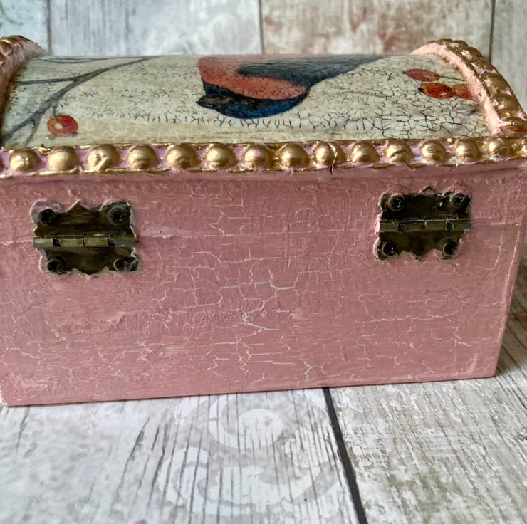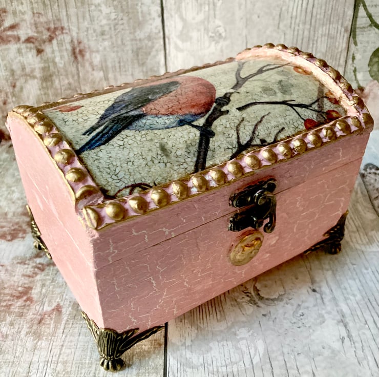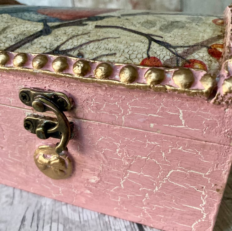 The rest of the box has been painted with white chalk paint base and a pink chalk paint top with a crackle glaze technique which gives the box a lovely vintage look.