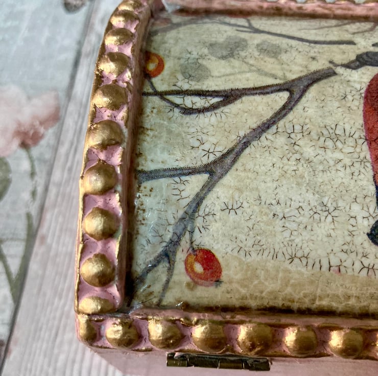 The lid has been craquelured to give fine porcelain like cracks and the edges of the box have been decorated using my handcrafted clay mouldings painted pink and finished with gold wax.
