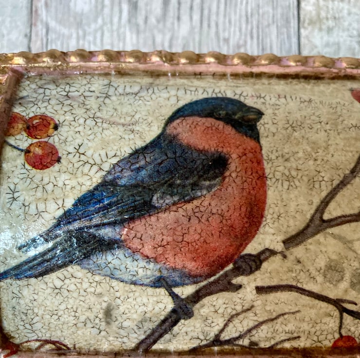 Beautiful Crackle Glaze Bullfinch & Berries Bird Vintage Jewellery Keepsake Box