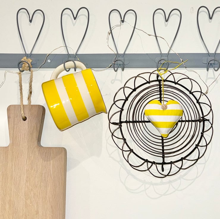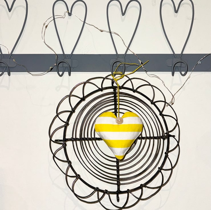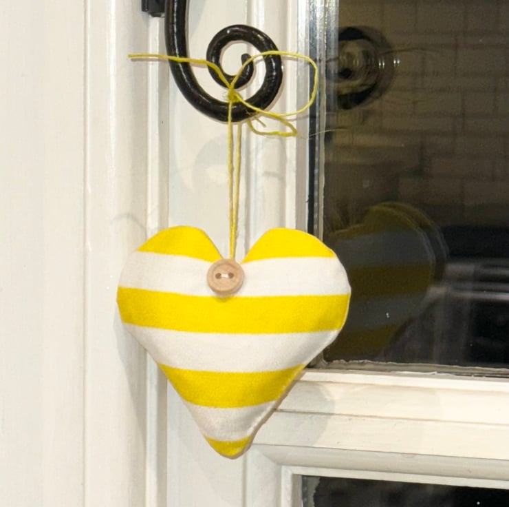 A 'heatherandhome' classic! Cheerful yellow and white striped heart decorations, filled with fragrant Hampshire lavender, hand finished with a little round wooden button and with natural hemp twine hanging ties.