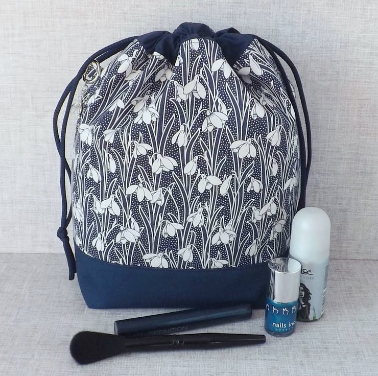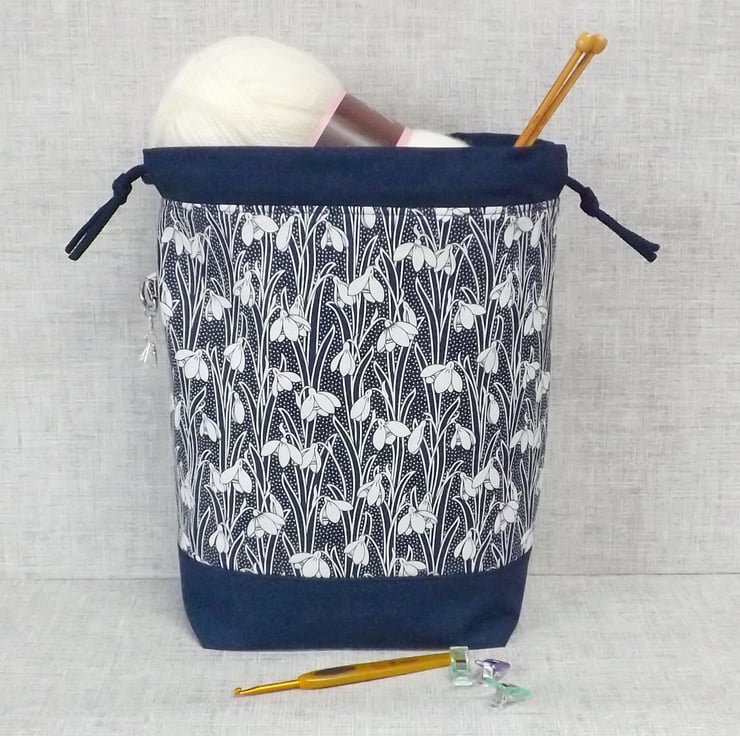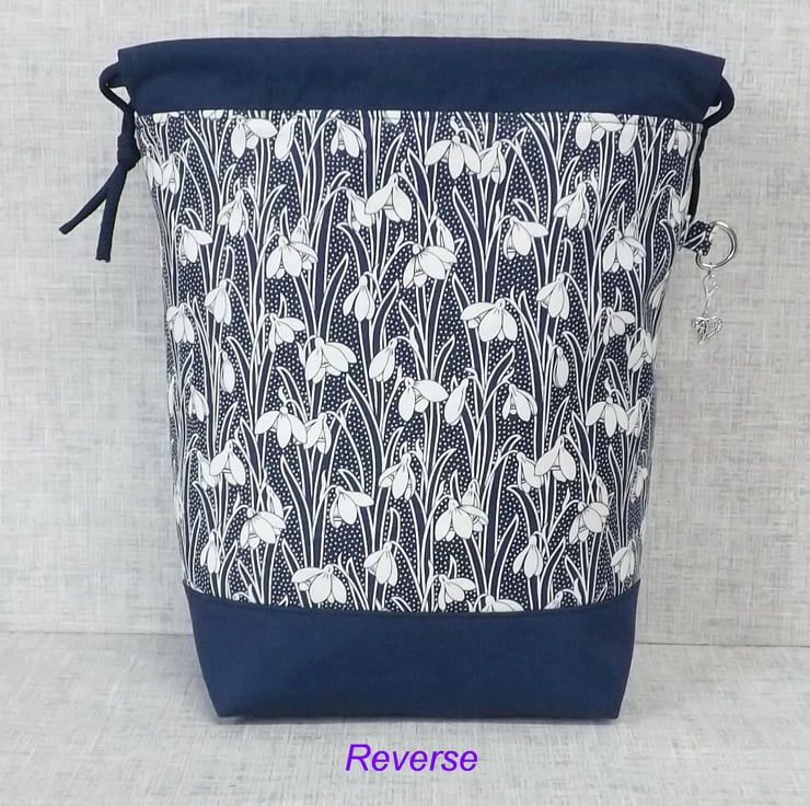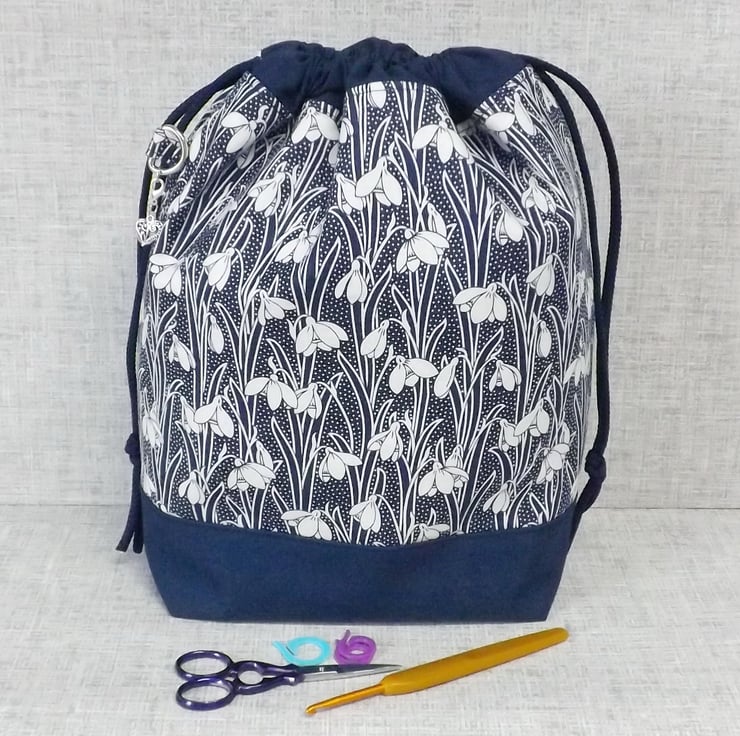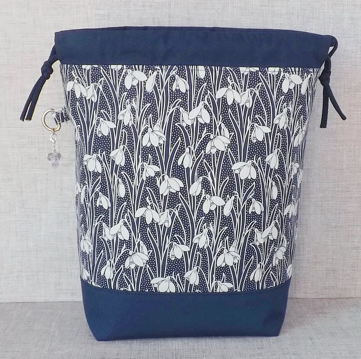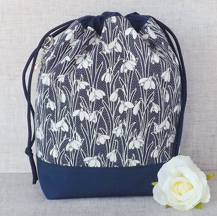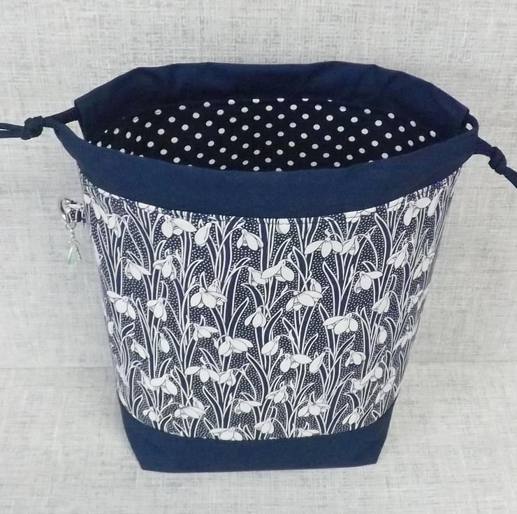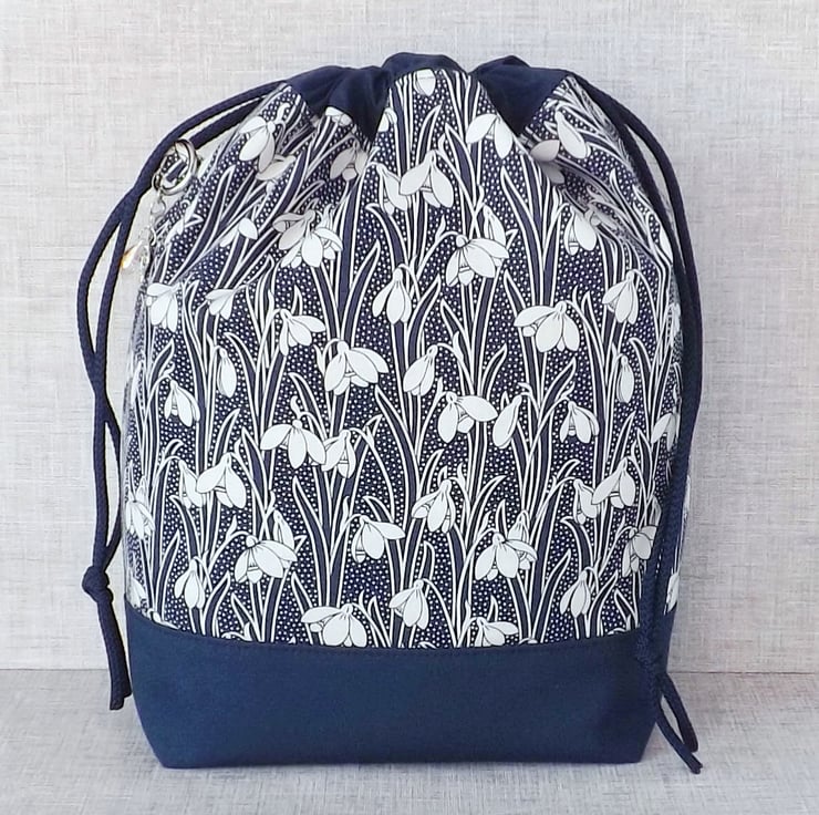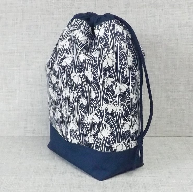 A project bag, drawstring bag, made from Liberty 'Hesketh House' quilting weight cotton in navy blue with a white snowdrop design, combined with a plain navy cotton fabric. The lining fabric is a navy cotton with white spots.