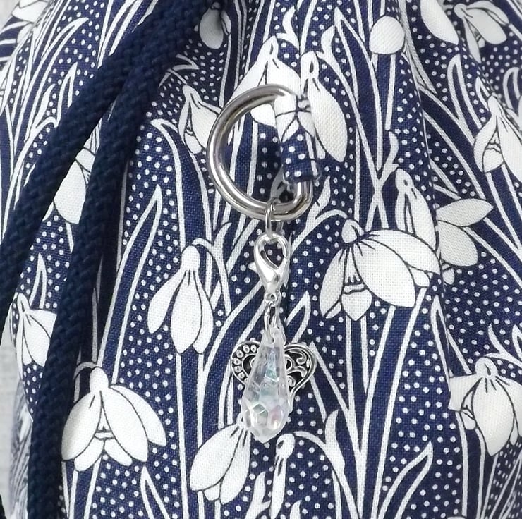 I have included a charm/stitch holder which is attached to a D ring on one side of the bag, and the bag closes with navy blue drawstrings.