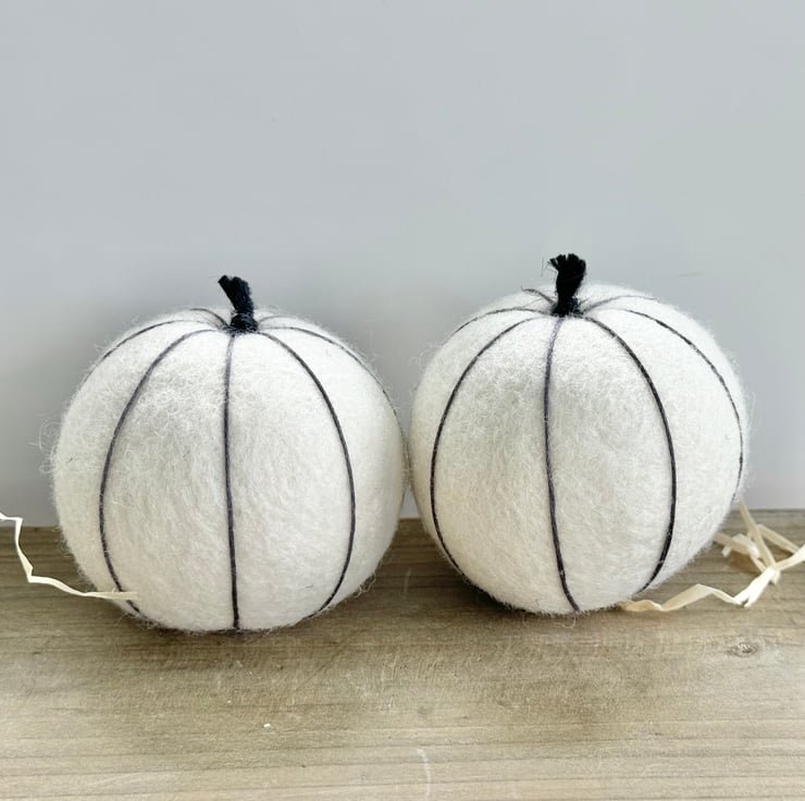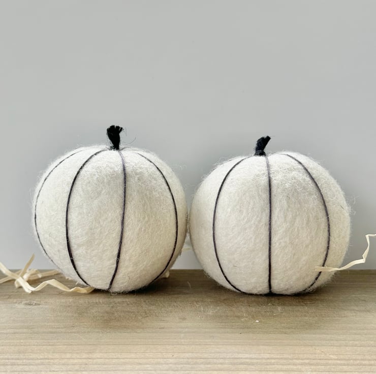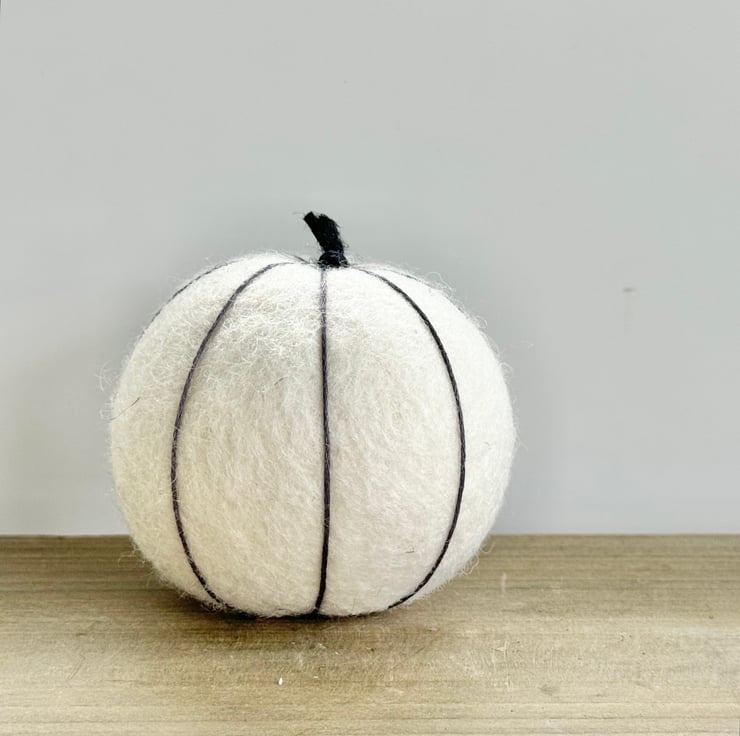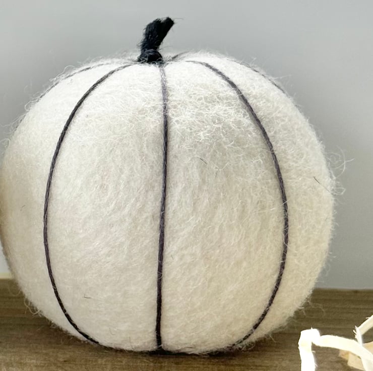 This larger size ecru-coloured pumpkin is made of tactile wool felt, and has delicate charcoal-grey embroidery thread 'veining' and is finished with natural twine for the twiddly stalk.