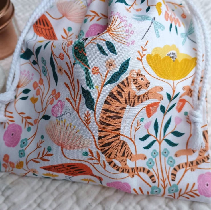 Stunning drawstring bag in a stunning floral tiger print. Ideal for storing all sorts of items from small sewing projects and craft supplies to make-up or jewellery. As well as being useful in the house or when traveling, they also make great re-usable gift bags.