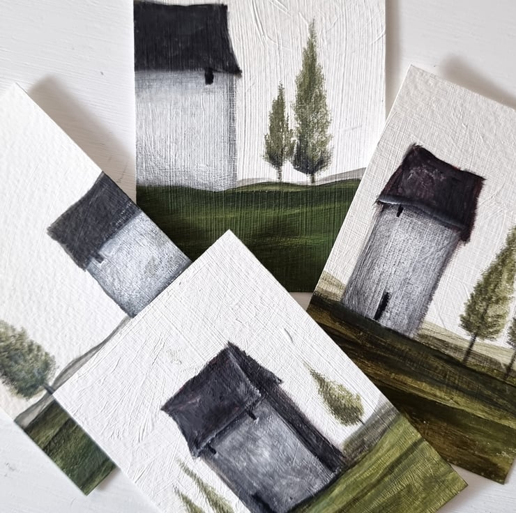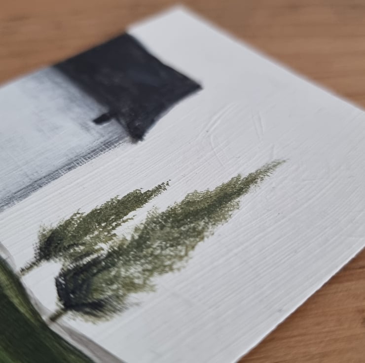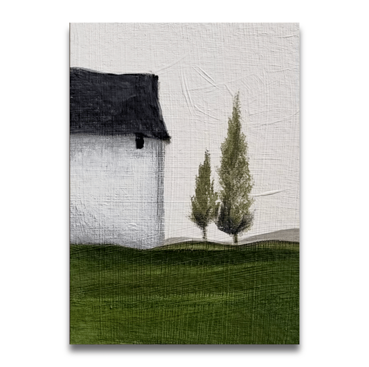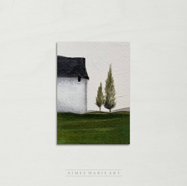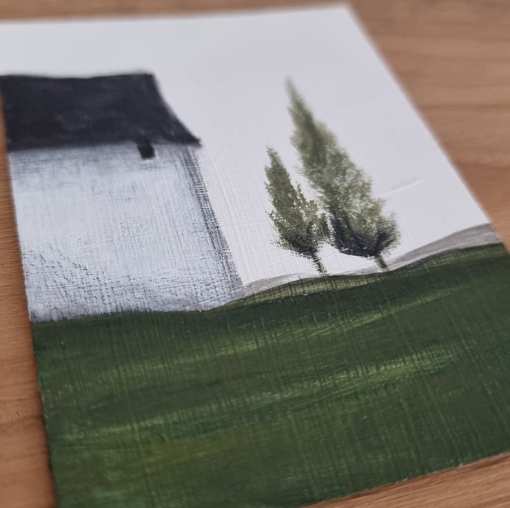 ACEO - A teeny tiny original one of a kind painting of a white house with trees in a green field. This little artwork is painted on textured paper. ACEO's are about the size of an average playing card. They make sweet little collectables, unique gifts, stocking fillers etc and can be framed. Approx overall size - 2.5 x 3.5 inches.