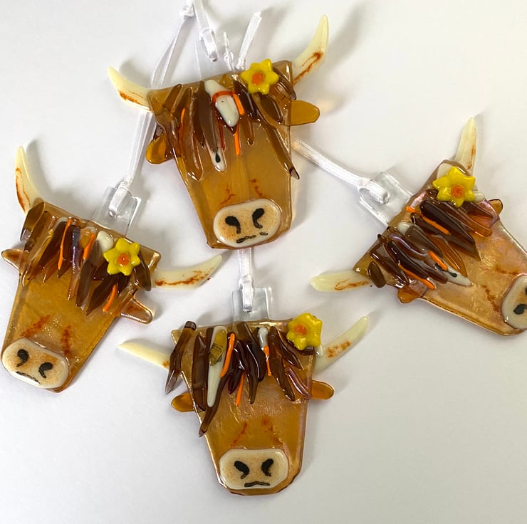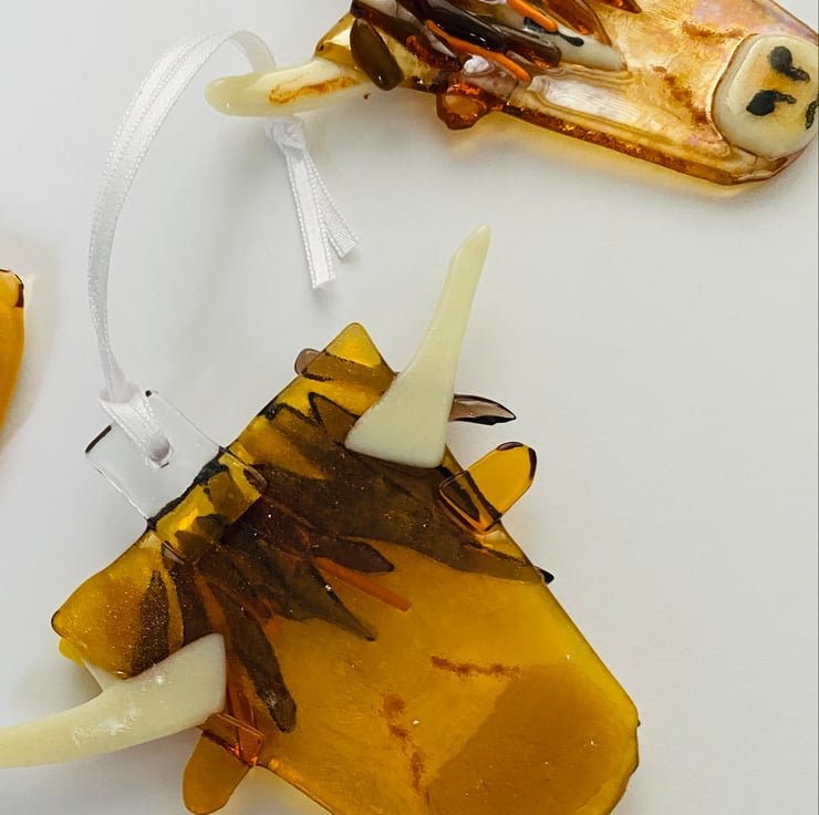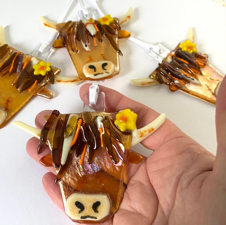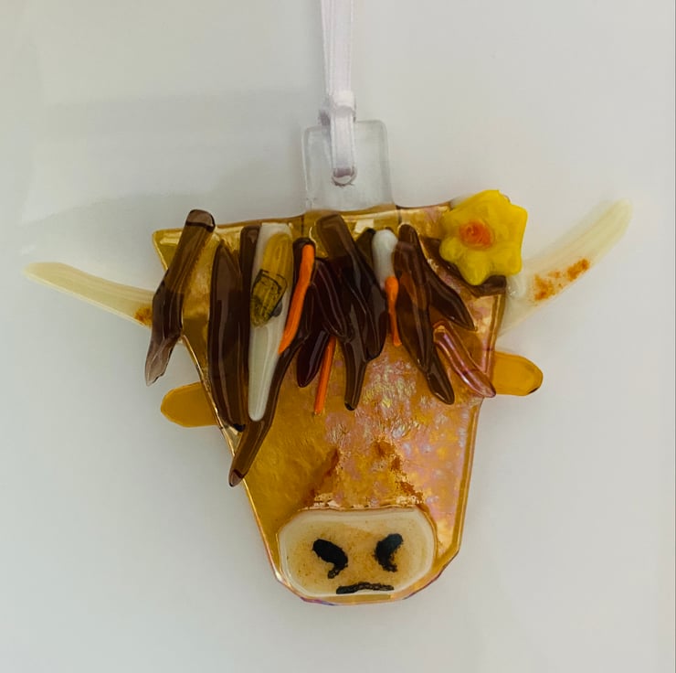 Meet the gorgeous Hetty highland cow fused glass hanging decoration. Created entirely from fused glass and formed in my kiln .