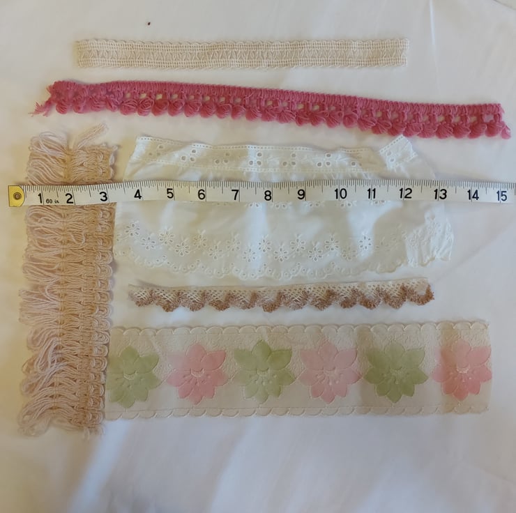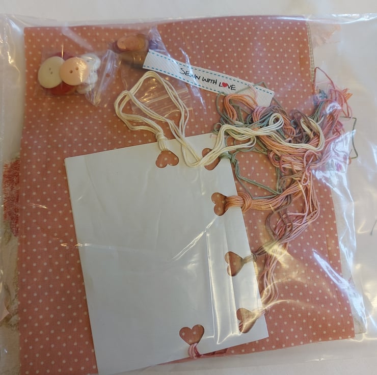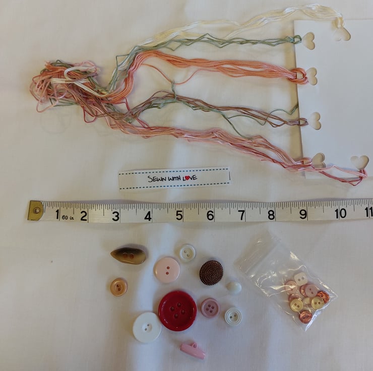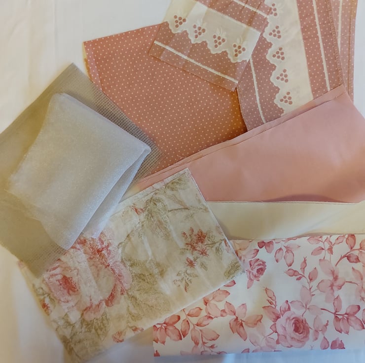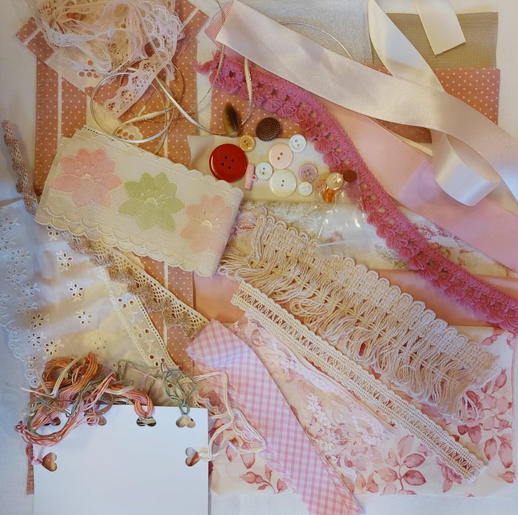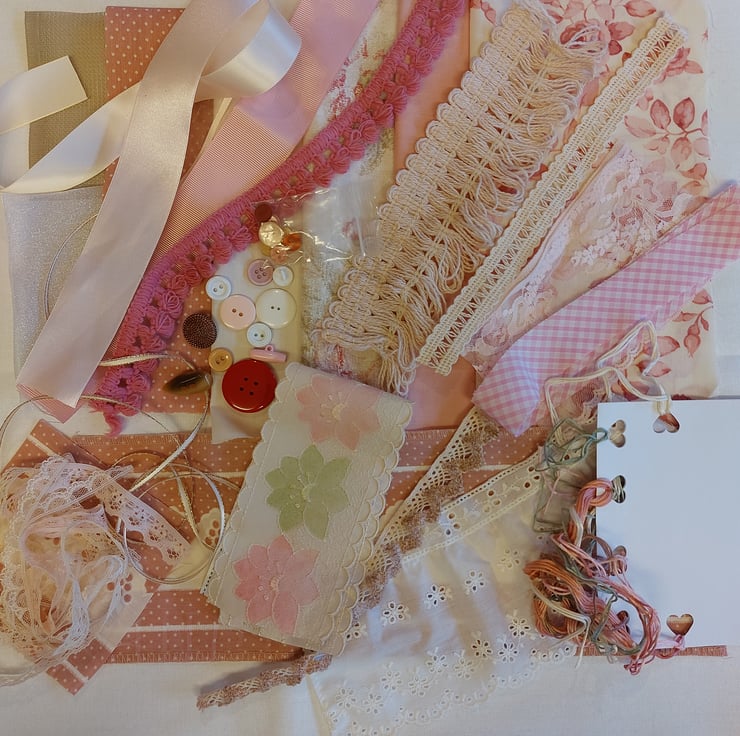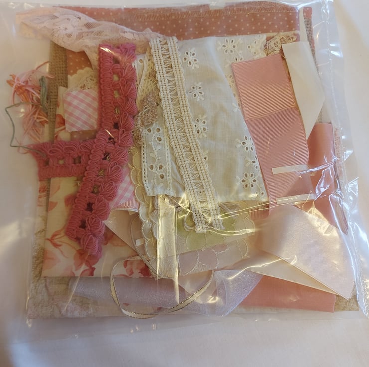 This kit includes 7 fabric pieces, 5 of which are polycotton - 3 10.5 inch squares, 1 floral 11 x 9 inch, organza 11 x 9 inch, aida 8 x 6 inch, small spot 13 x 8 inch. small spot and broderie print 13.5 inch plus small piece. Trims are 5 lace pieces in different lengths, 2 vintage crochet lace, vintage fringe, vintage trim 3 x 12 inch pink vintage trim, pink gingham bias binding, 5 pieces of ribbon in various lengths. broderie anglaise trim 4 x 9 inch. selection of embroidery threads, selection of vintage buttons and a sewn with love label.