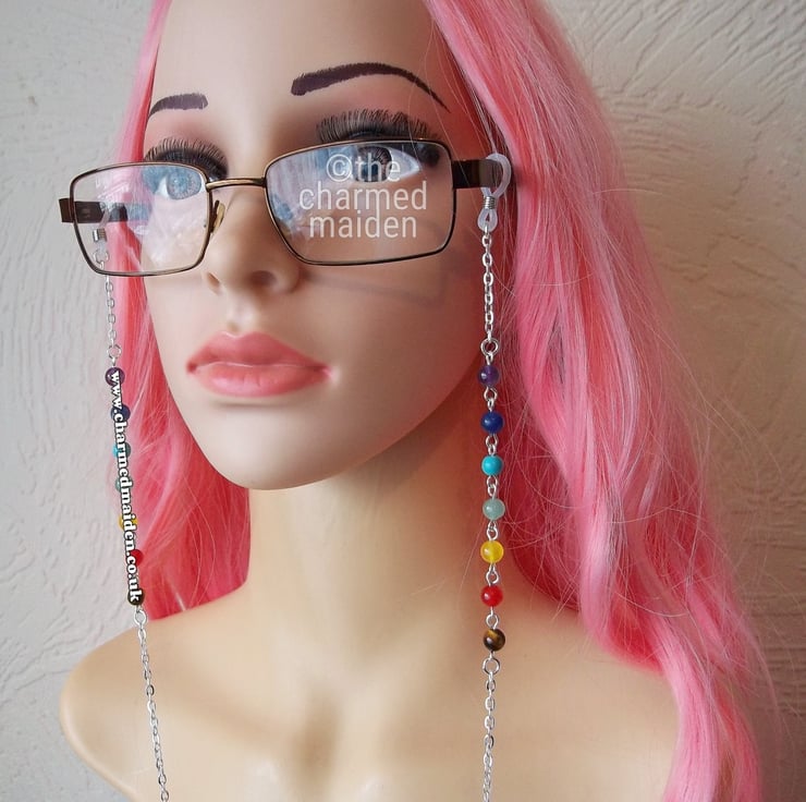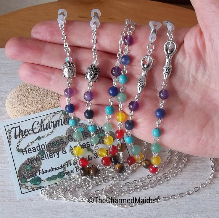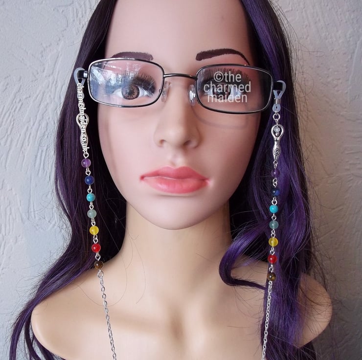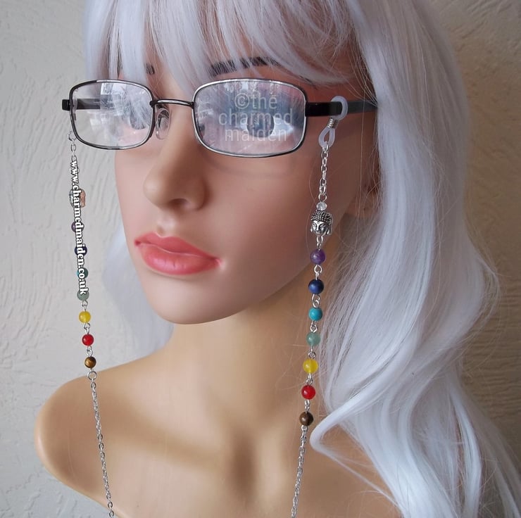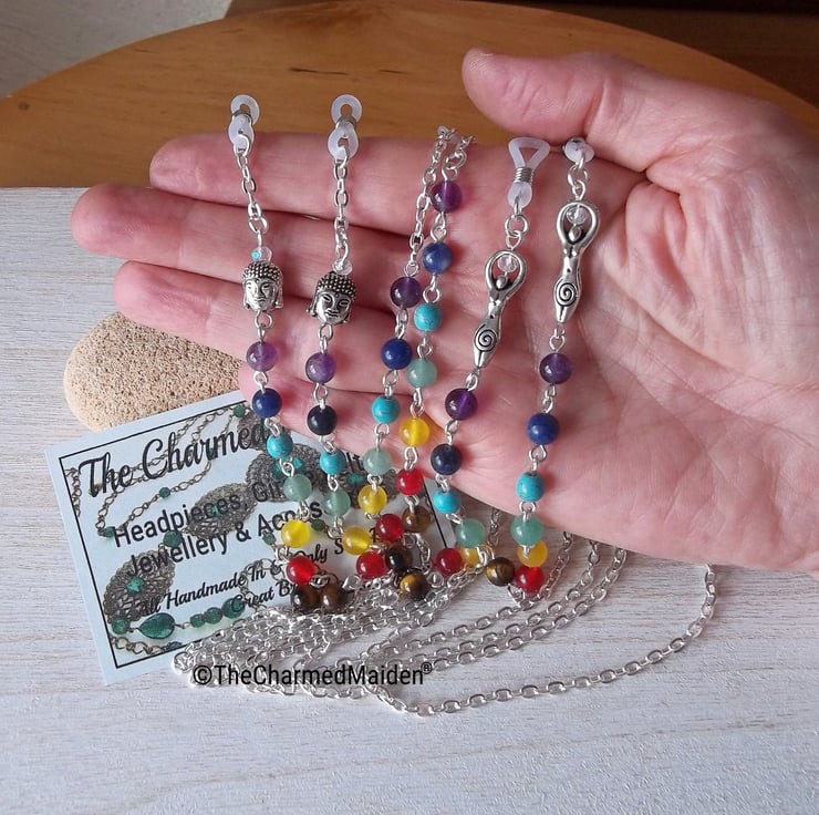 Beautiful gemstone beaded Chakra glasses chain. Three styles to choose from: beads only, buddha & beads, goddess & beads.