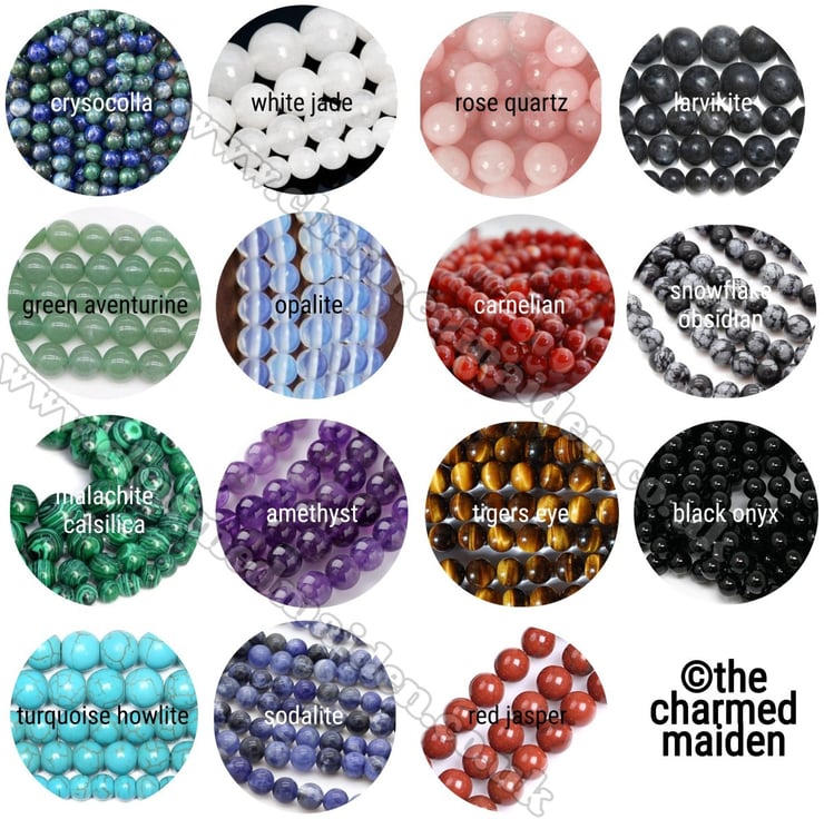 The bead options are: Crysocolla, White Jade, Rose Quartz, Larvikite, Green Aventurine, Opalite, Carnelian, Malachite Calsilica, Amethyst, Tigers Eye, Black Onyx, Turquoise Howlite, Sodalite, Red Jasper