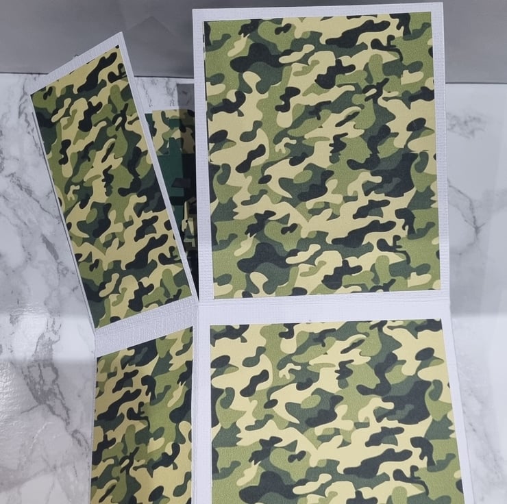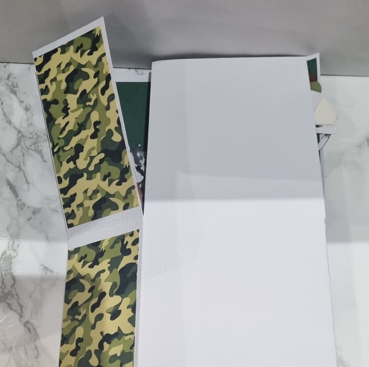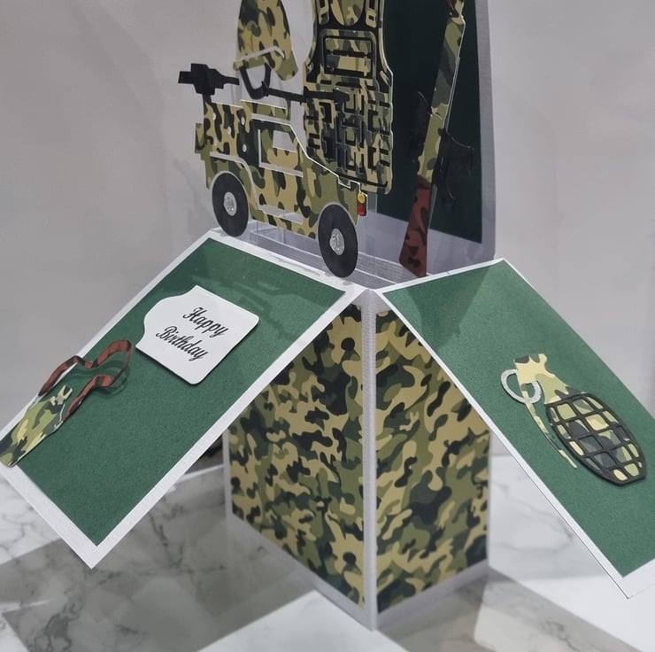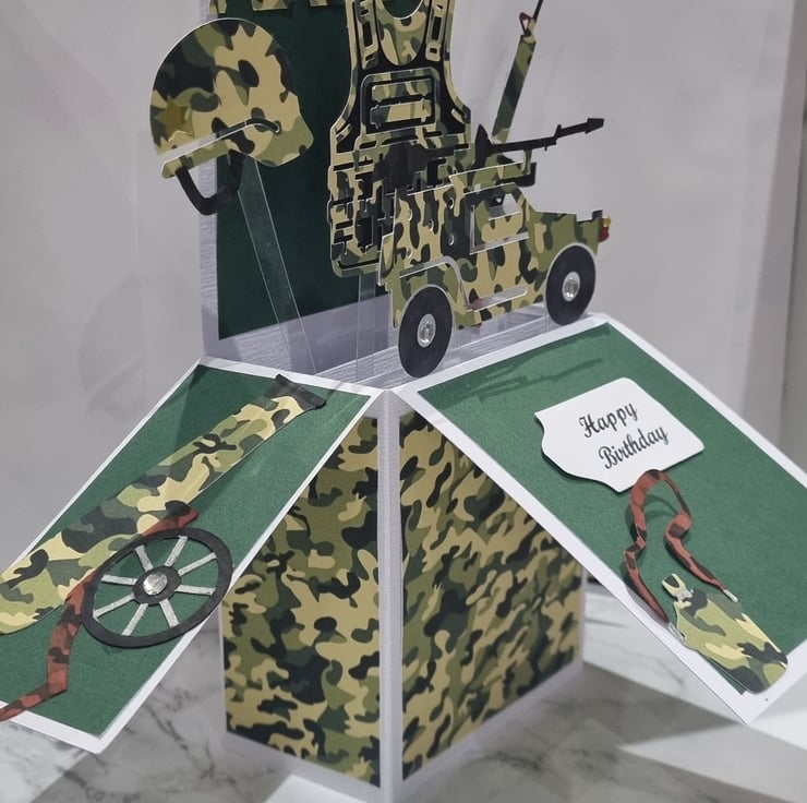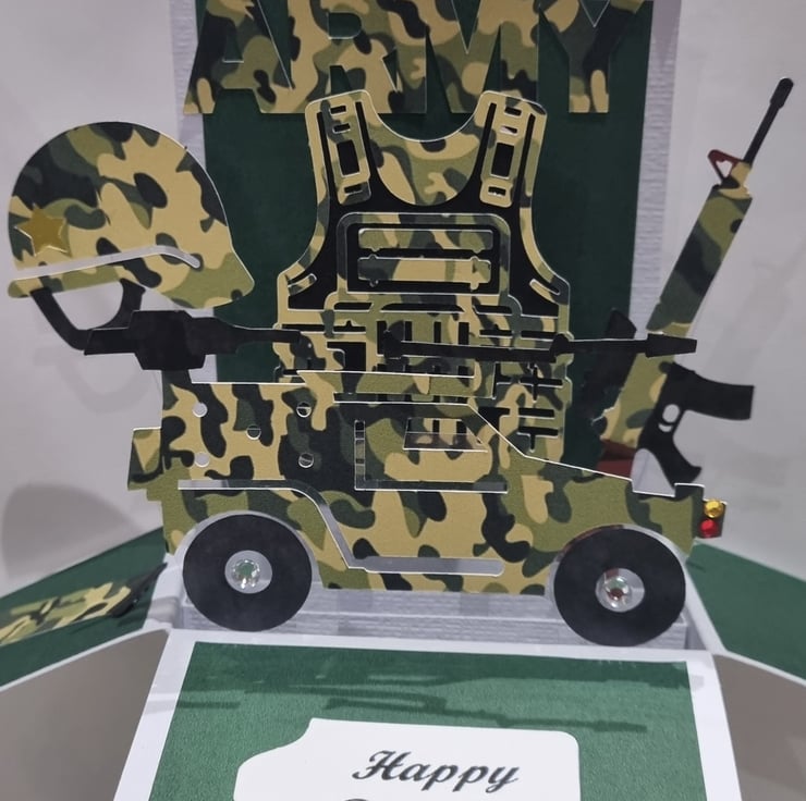 This spectacular hand made Army themed card contains several 2d pictures as seen in the pictures. Each surface has a pattern and to the rear of the card is a blank surface for you to hand write your personalised message. Each card comes protected with a cellophane cover, along with a plain white envelope which is all inside a protected "Do not bend" protective cover.