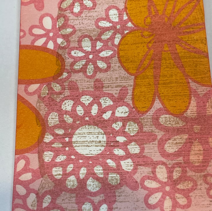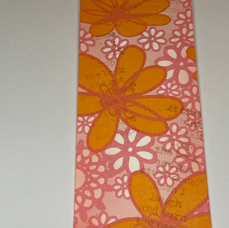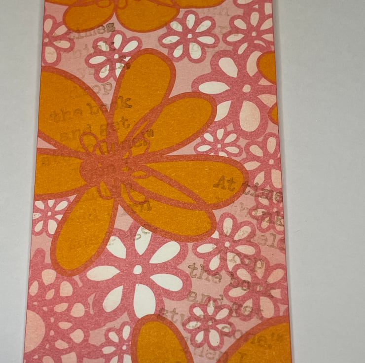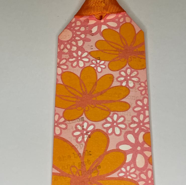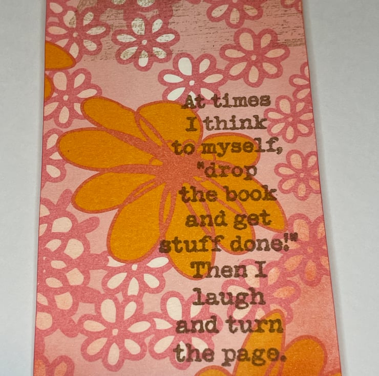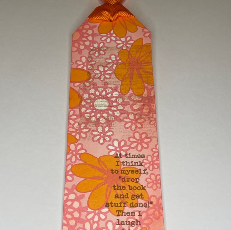 One for the bibliophiles. A retro floral pink and orange bookmark with swirly flowers, stamping and a ribbon top. This 18cm, 24cm including the ribbon, bookmark is definitely jazzy. It has a retro inspired paper which features swirly flowers and daisies. This is in a pale pink and vibrant orange. It has some inking around the edges and stamping of a book pile and the phrase At times I think to myself, "drop the book and get stuff done!" Then I laugh and turn the page. Great for any book lover. It is completed with a wide grosgrain orange ribbon.