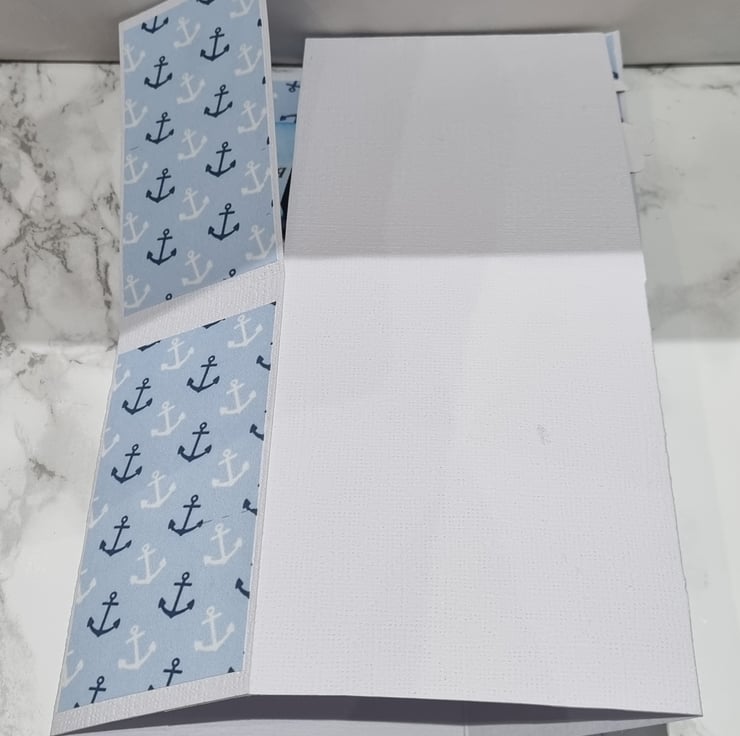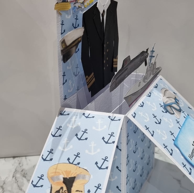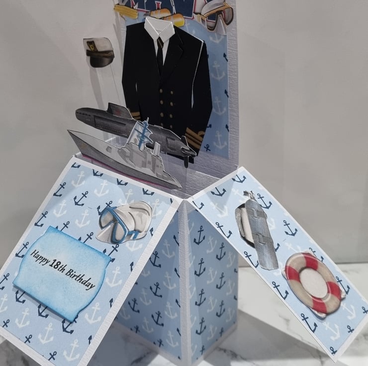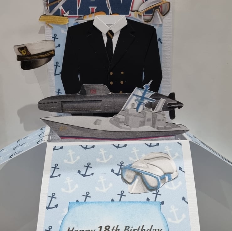 This spectacular handmade Navy theme card is best for Navy lovers. This card contains several 2d pictures as seen in the pictures. Each surface has a pattern and to the rear of the card is a blank surface for you to hand write your personalised message. Each card comes protected with a cellophane cover, along with a plain white envelope which is all inside a protected "Do not bend" protective cover.