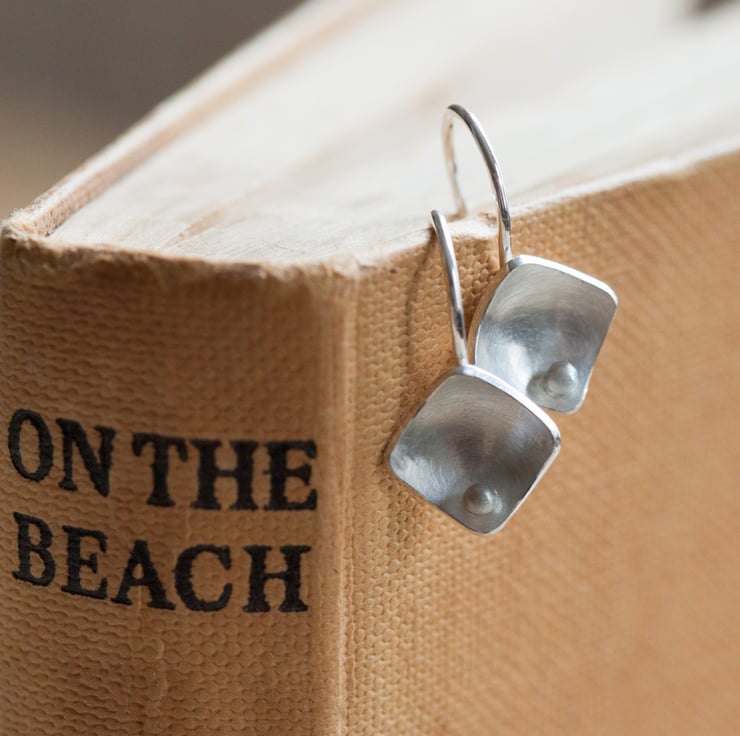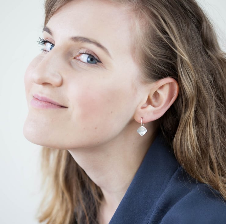 Always hand cut so each is perfectly imperfect. Add class to any outfit with these timeless pearlescent square drop earrings. These recycled sterling silver geometric earrings have a luminous brushed silver finish and a softer edge to capture the illusion of pearl in a shell. Pick these as a thank you gift for the mother of the bride.
