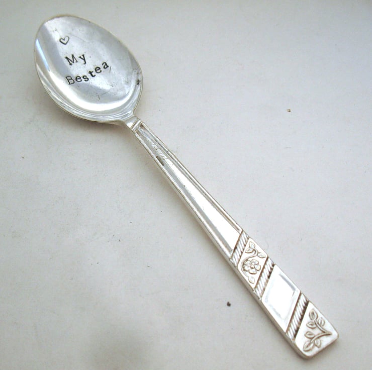A hand stamped vintage teaspoon with the words 'My Bestea' and a little heart. An ideal gift for a tea-loving best friend!