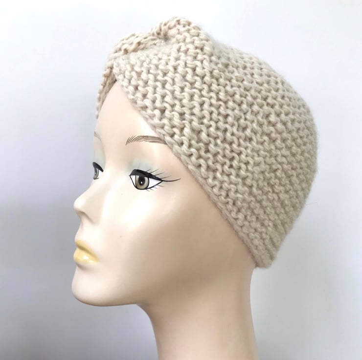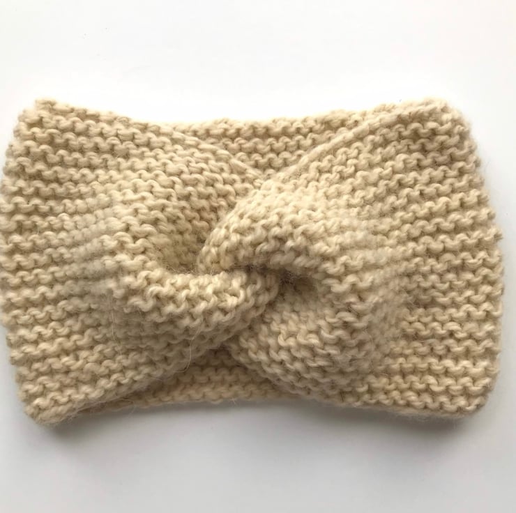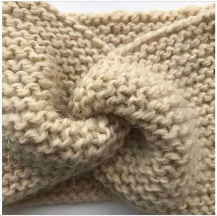 I’ve knit this headband using a 10% alpaca chunky yarn in a lovely shade of cream. It is super soft and fluffy!