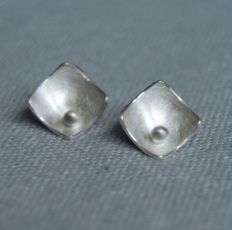 Each silver square stud has a pearl like silver ball in one corner with a gorgeous brushed silver finish, giving the illustrious pearlescent look. All hand cut and assembled to order from recycled sterling silver for an eco conscious choice.