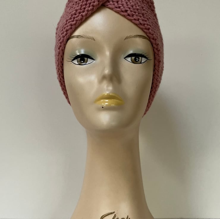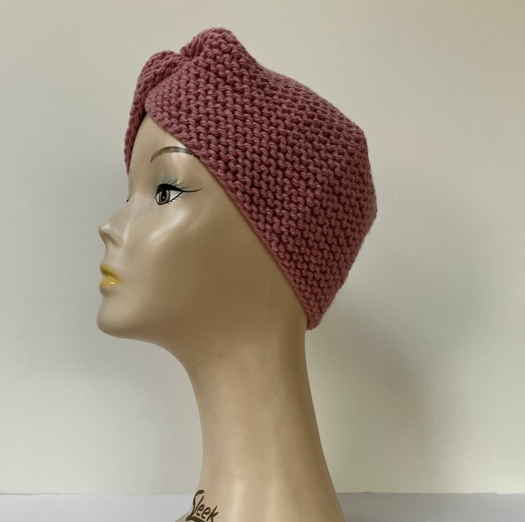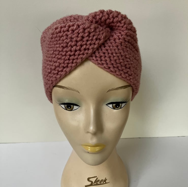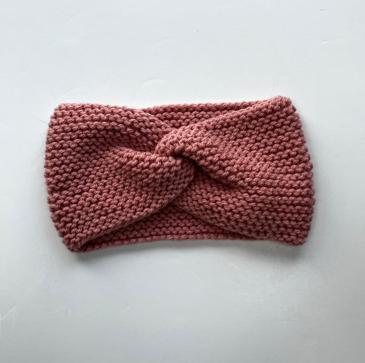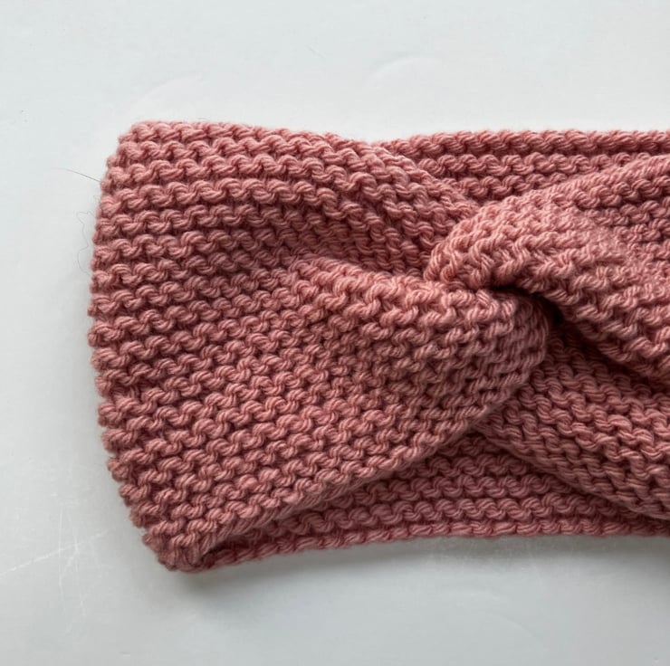 I’ve knit this headband using a 20% wool blend chunky yarn in a pretty shade of pink.