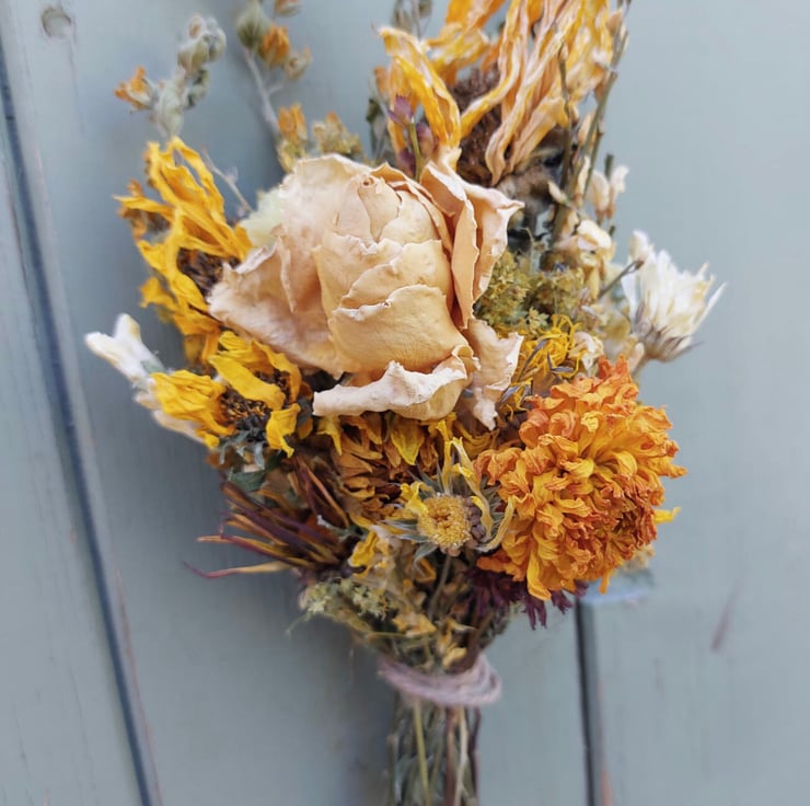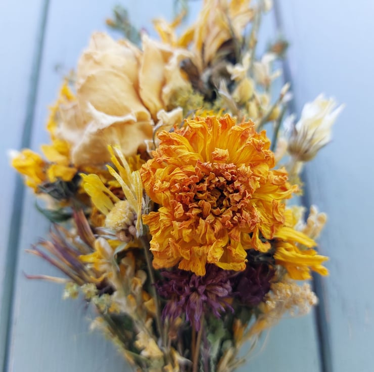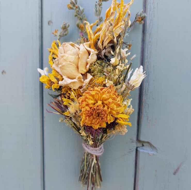 A bunch of dried flowers and foliage in shades of yellow. Tallest flower in the bunch is approximately 20cm and the bunch measures approximately 10cm wide.