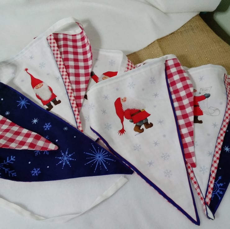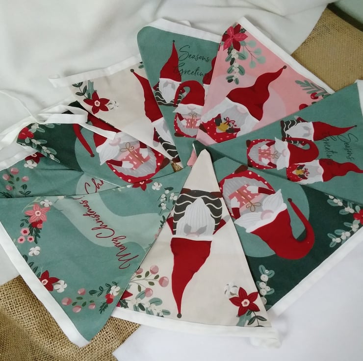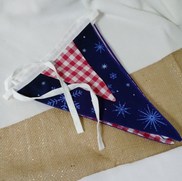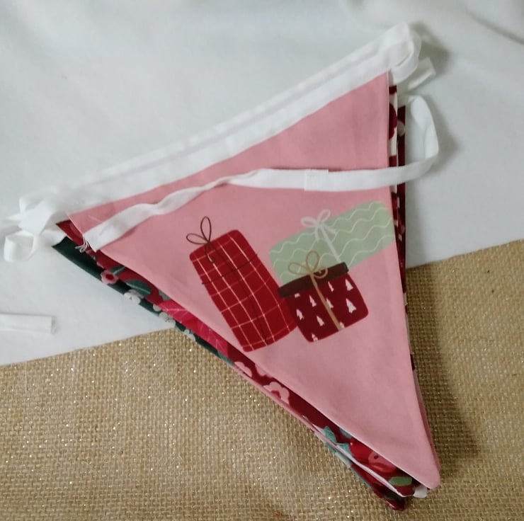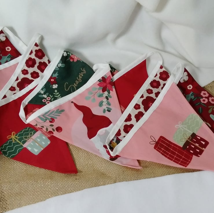 Beautifully handmade decorative bunting to elevate your festive decor. Made with printed 100 % cotton , each pennant is double sided and so can be hung across a room ( where both sides can be seen ) rather than against the chosen wall. ( only the front can be seen )
