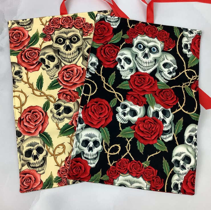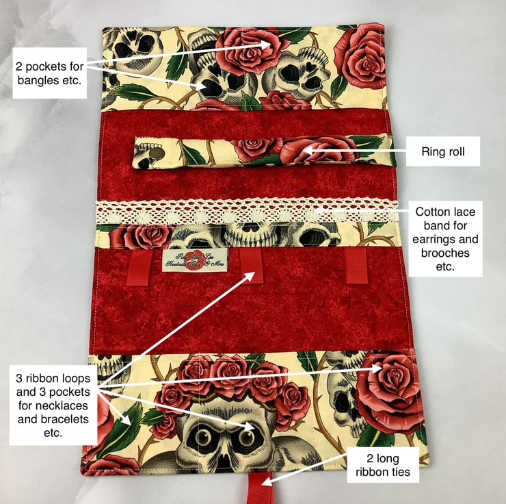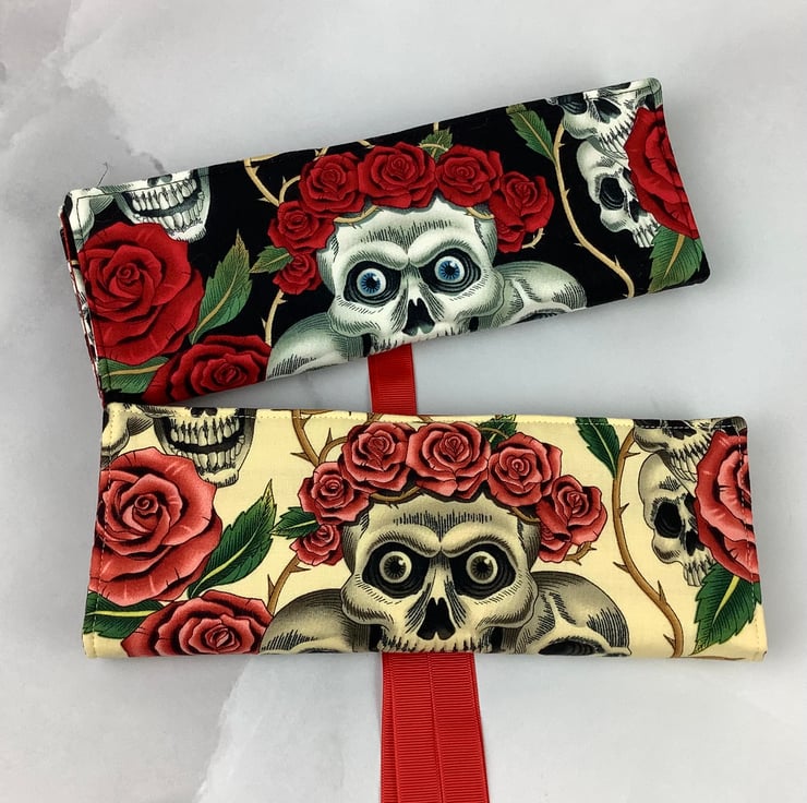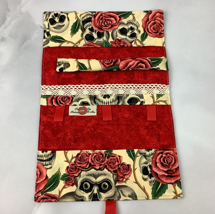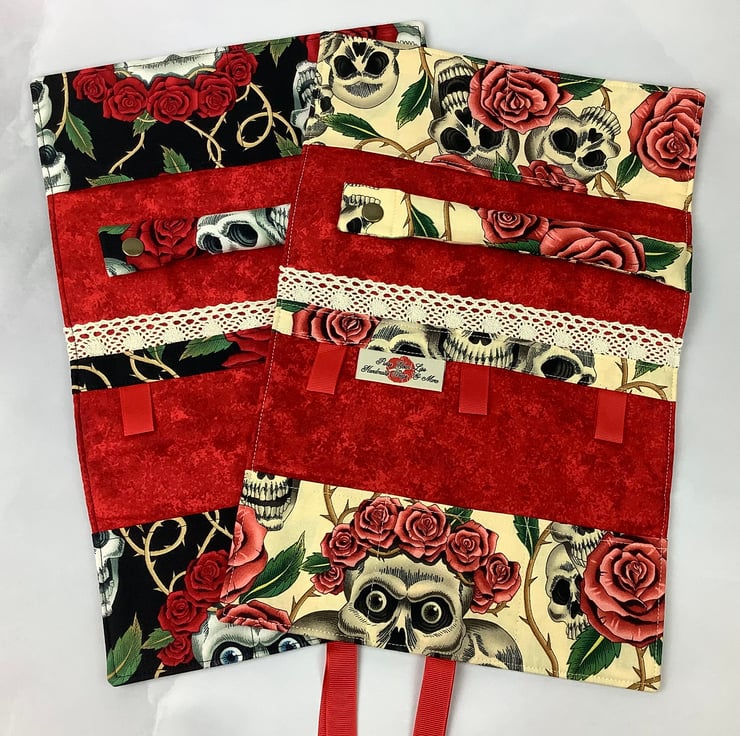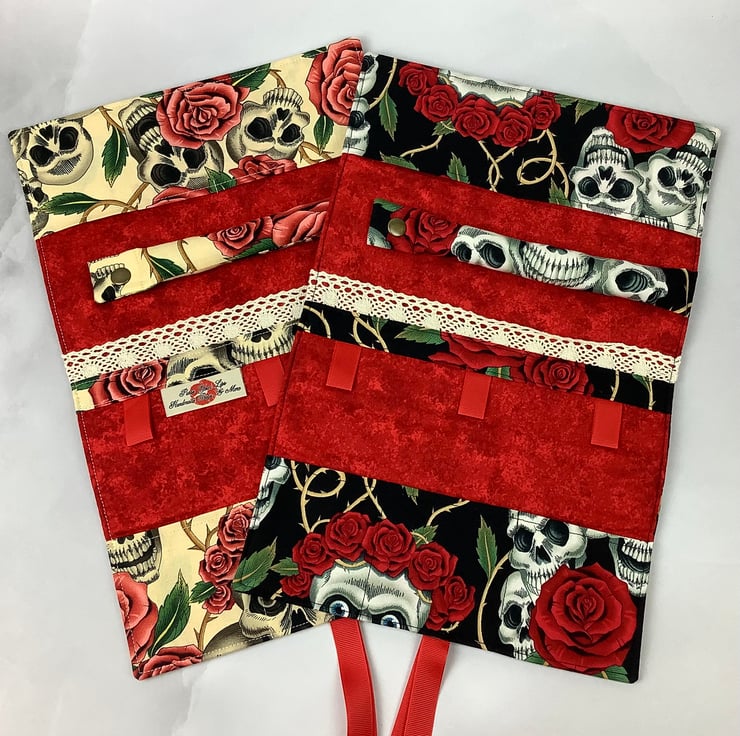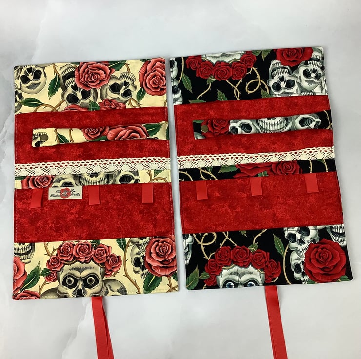 Skulls and roses jewellery roll, Gothic jewellery storage, 2 colour options